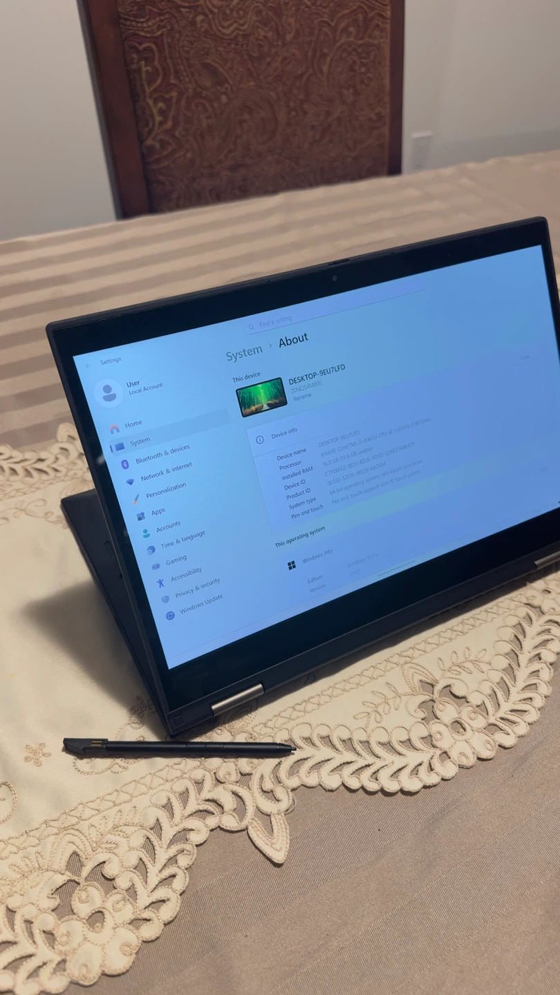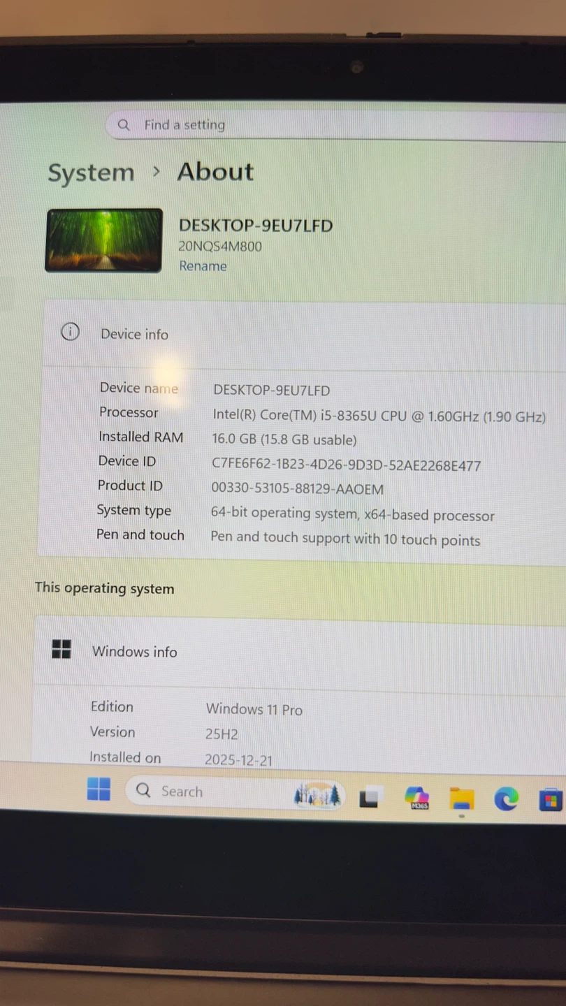 This is a Lenovo ThinkPad laptop with an Intel Core i5-8365U processor and 16GB of RAM. It has 256GB of storage and pen and touch support with 10 touch points. It's running Windows 11 Pro and was installed on 2025-12-21.