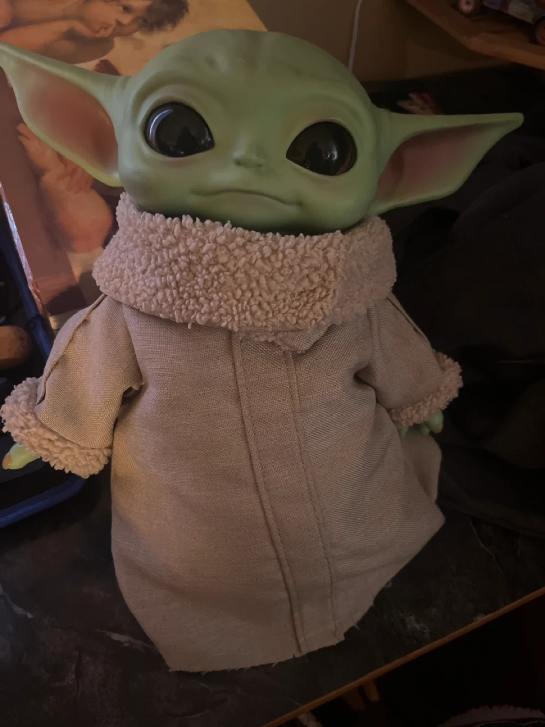 This is a plush toy of Grogu, also known as The Child. It's made of soft material and wears a fabric robe with a sherpa-lined collar. It's a fun collectible for Star Wars fans!