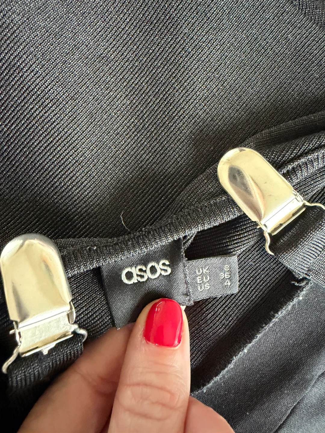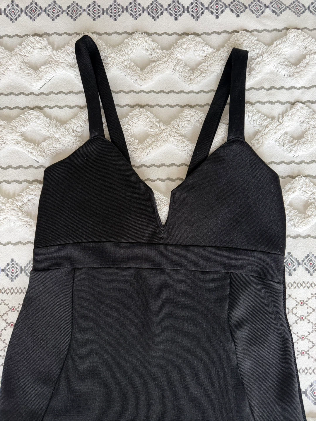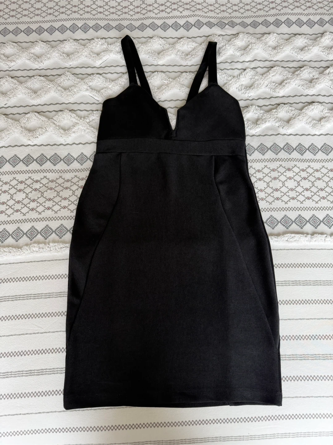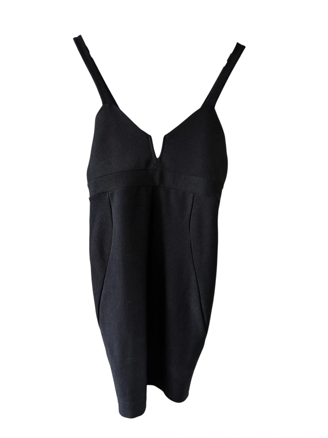 This black mini dress features a flattering V-neckline and suspender-style adjustable straps. It's made of a slightly stretchy, textured fabric. Size 4.