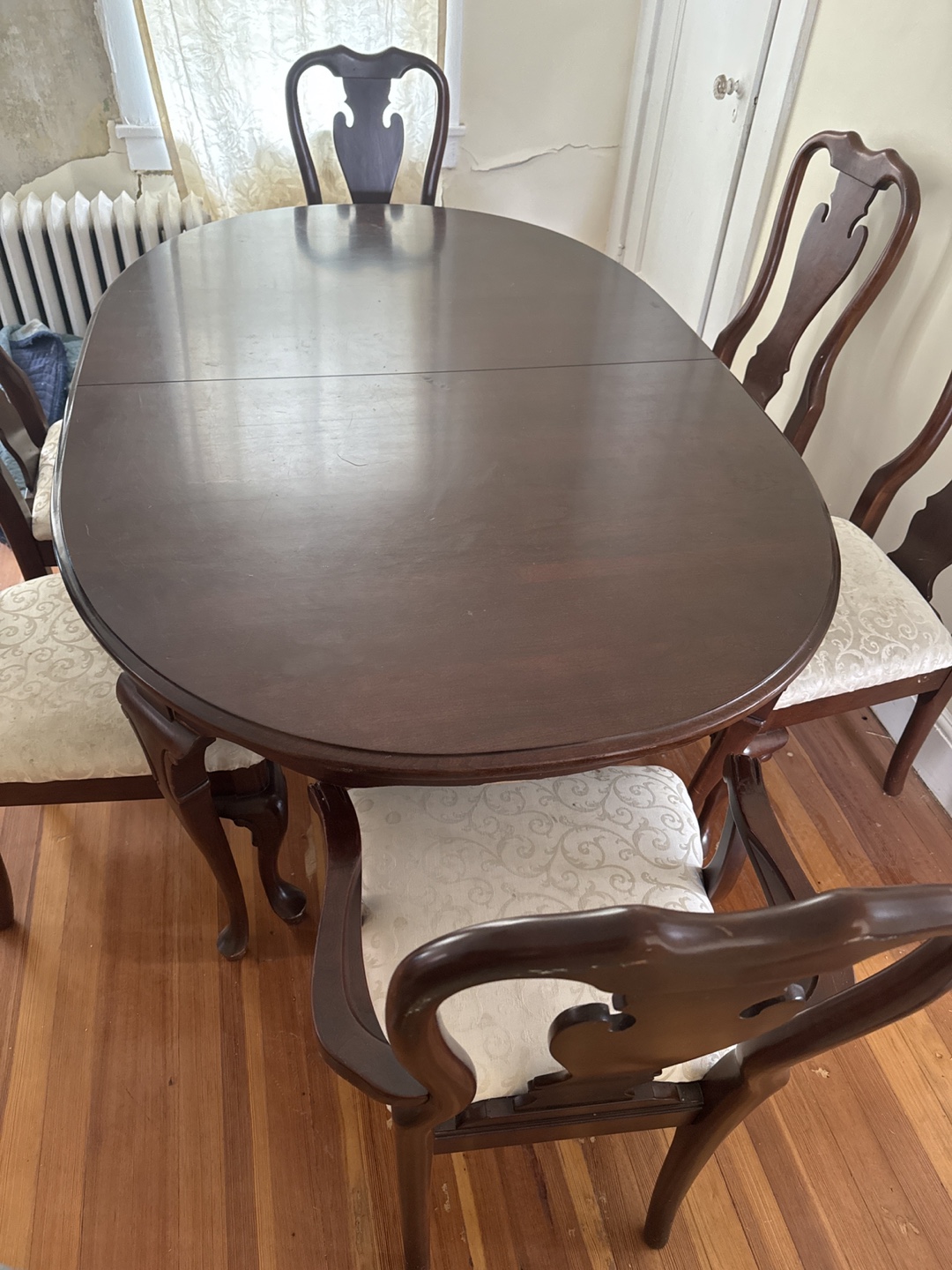 Dark wood oval dining table set. Includes six upholstered chairs. Chairs have a light damask pattern. Table has a leaf for extension.