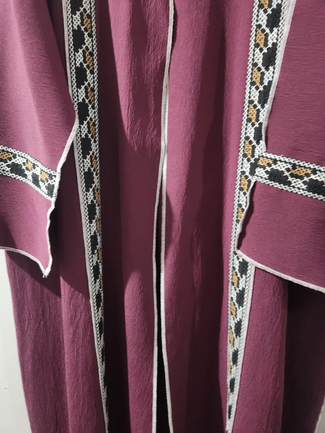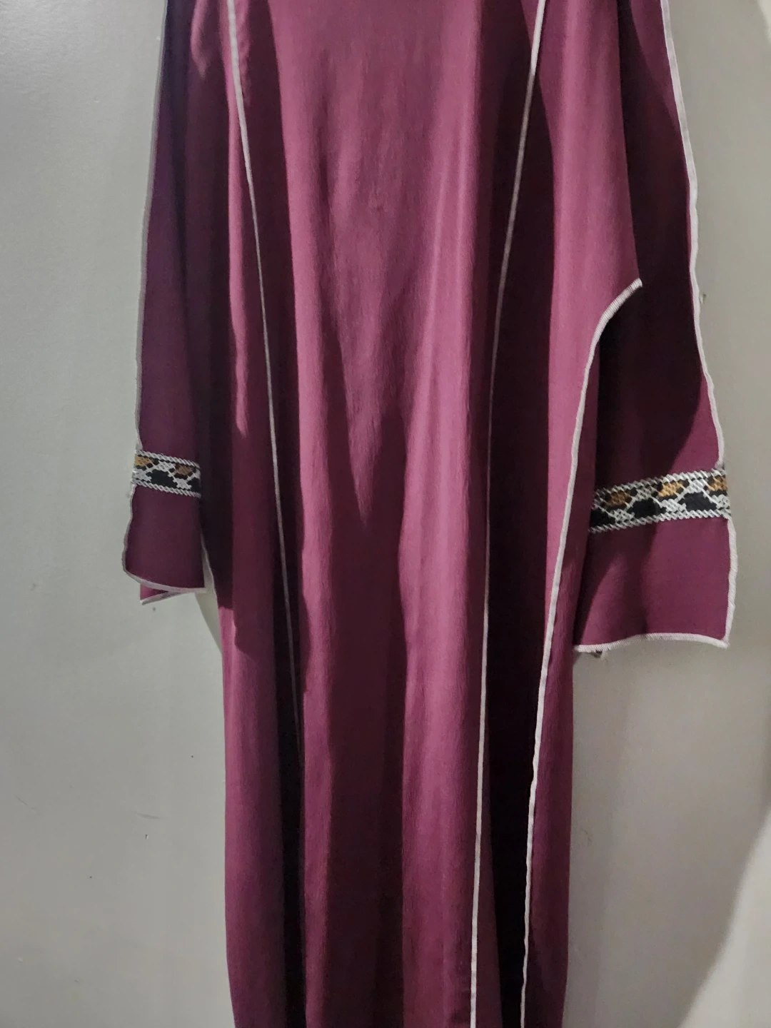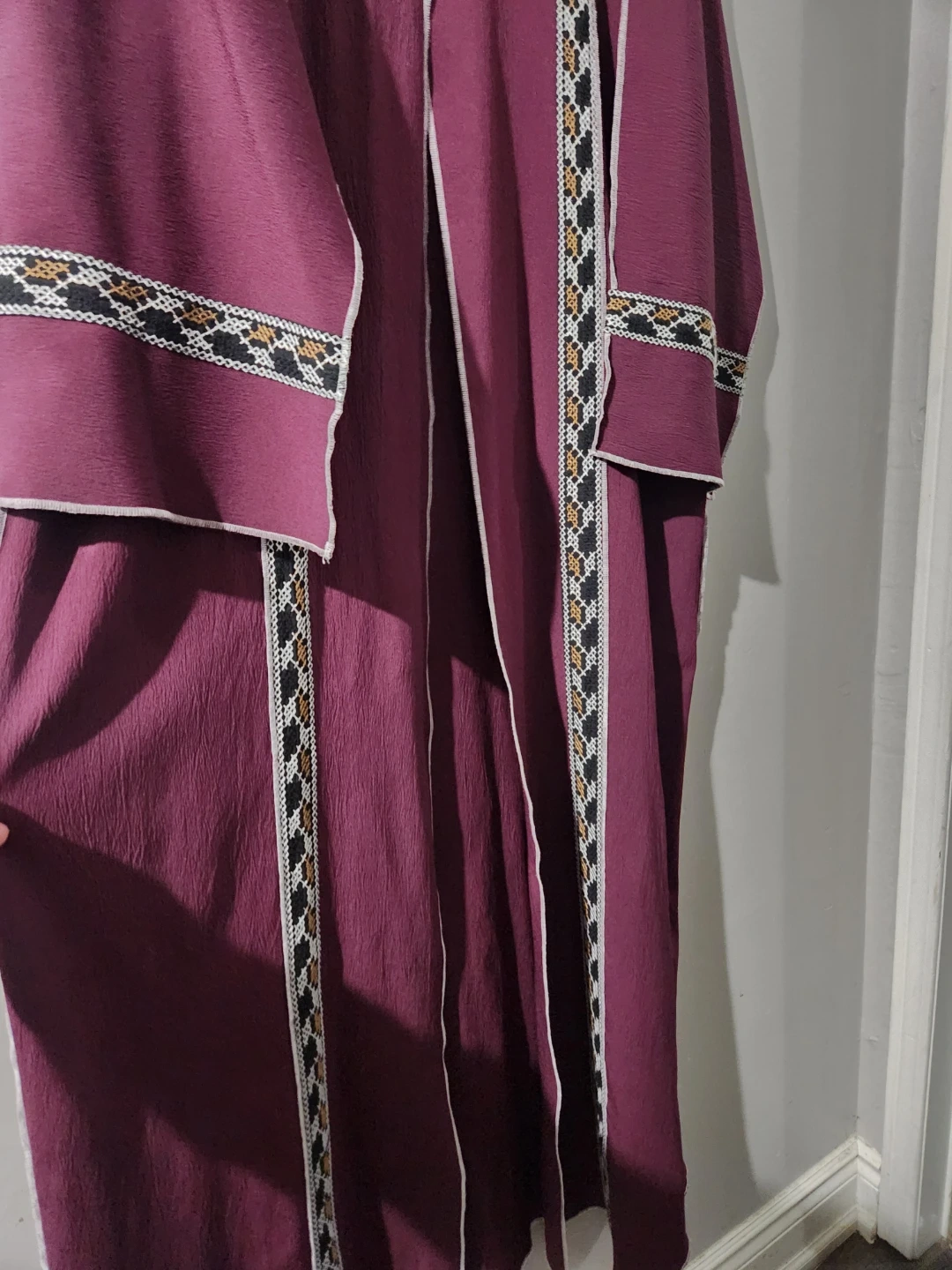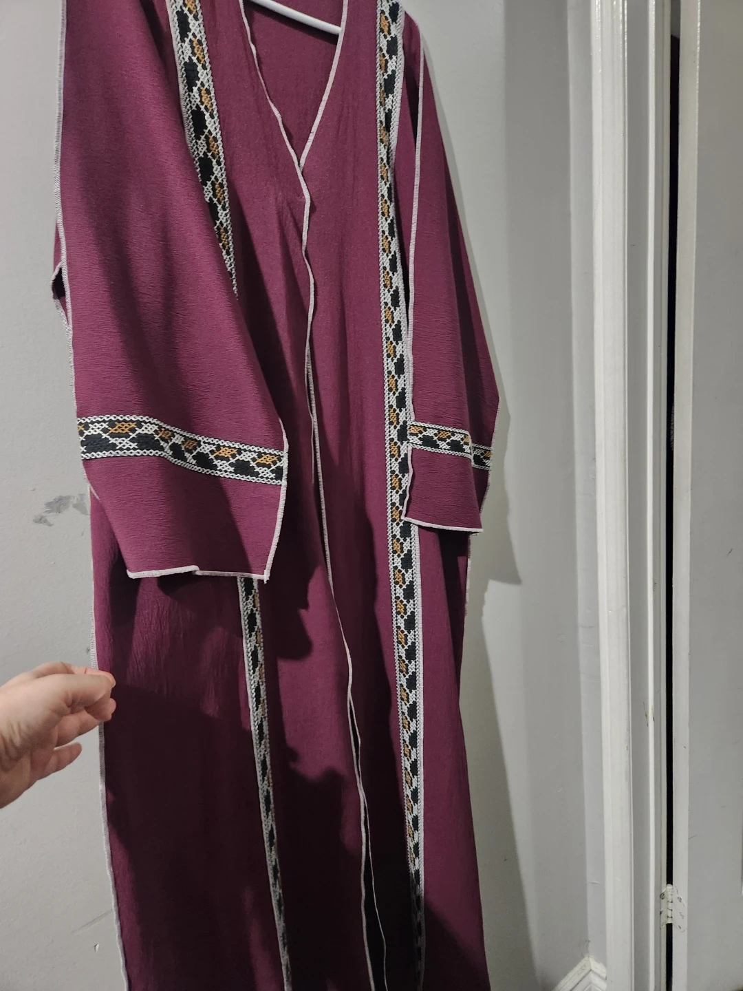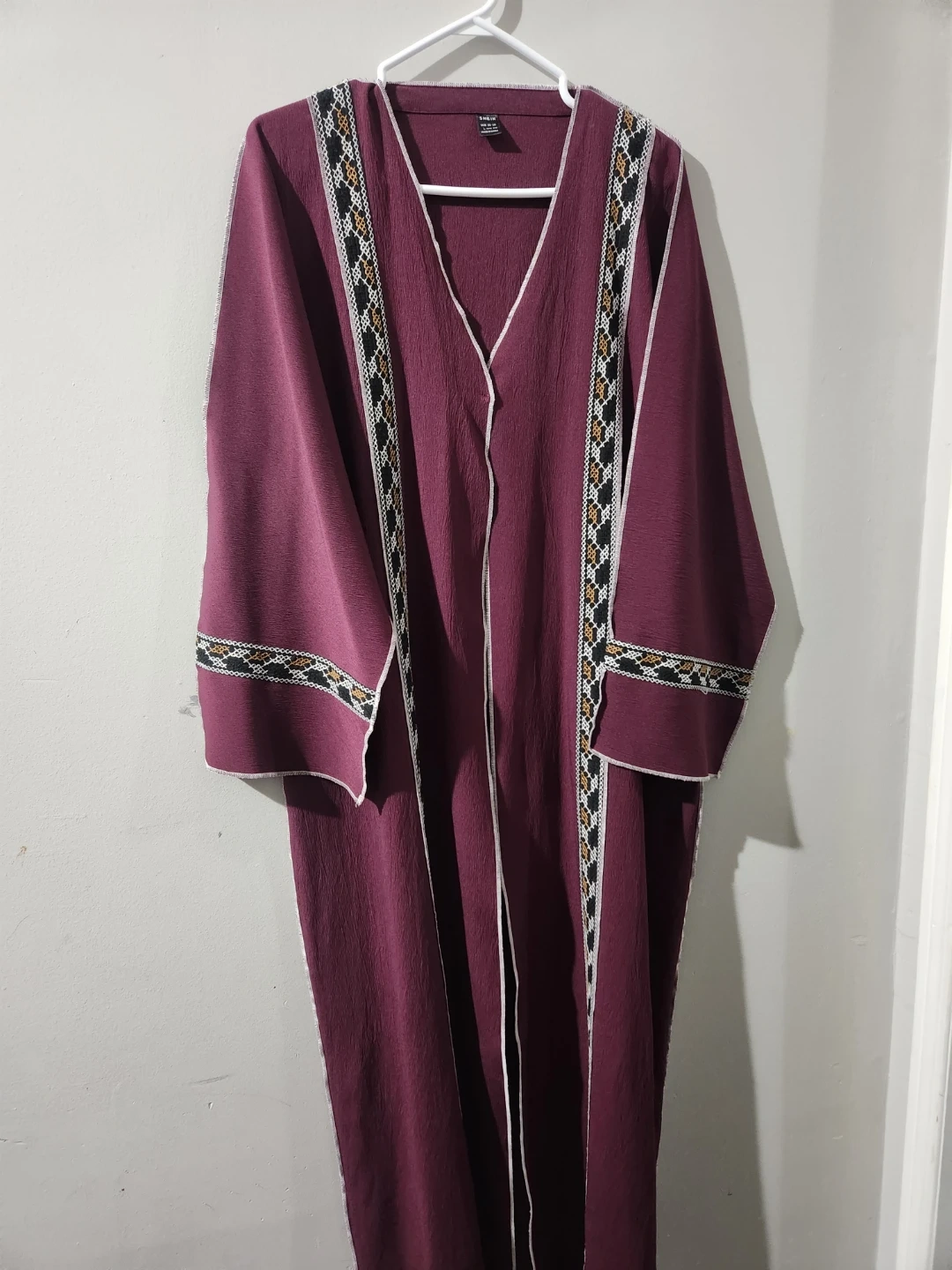 A burgundy kaftan dress from SHEIN featuring intricate embroidered trim. It has a v-neckline and a flowing silhouette. Great for casual wear or layering!