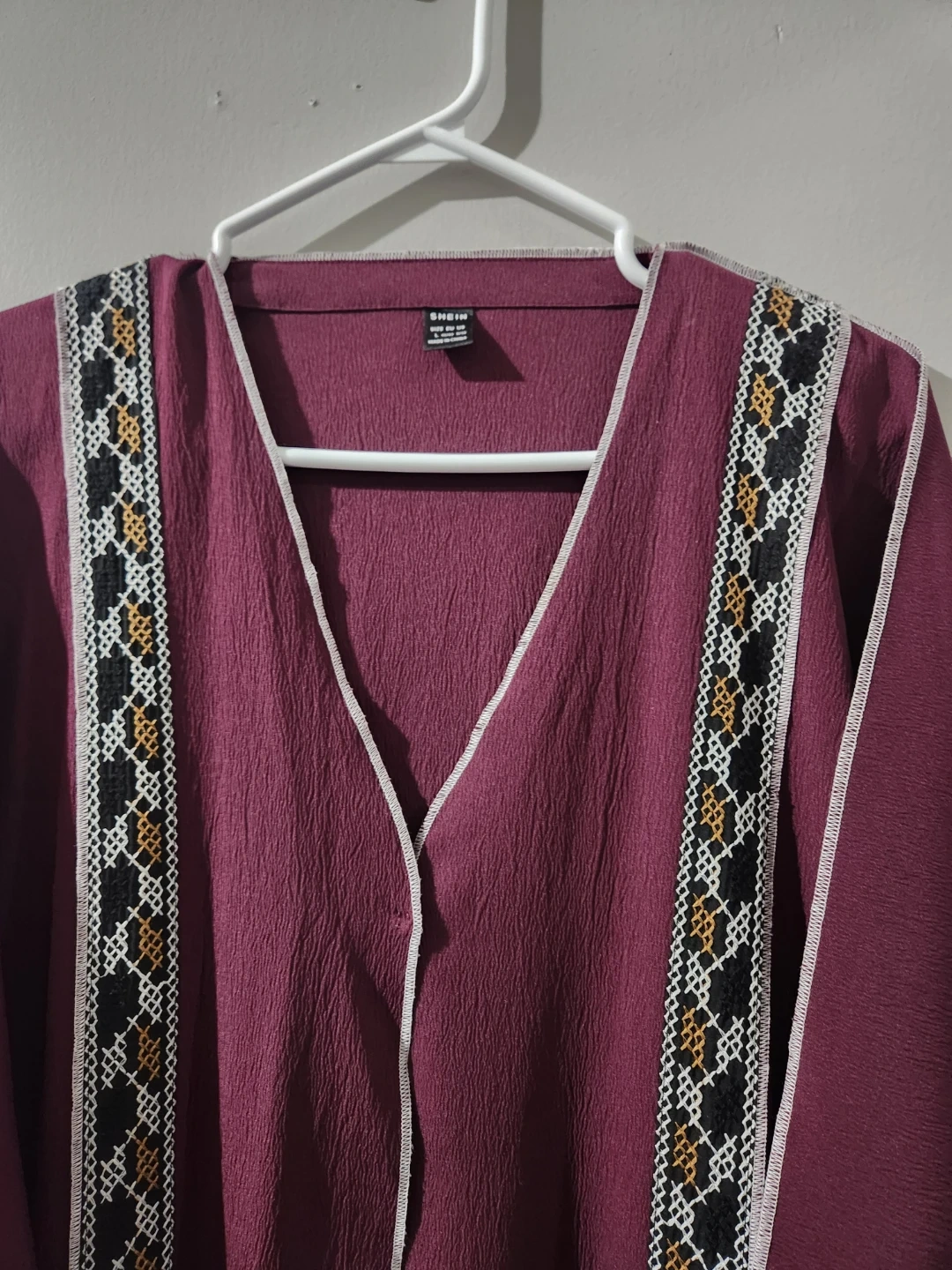 A burgundy kaftan dress from SHEIN featuring intricate embroidered trim. It has a v-neckline and a flowing silhouette. Great for casual wear or layering!