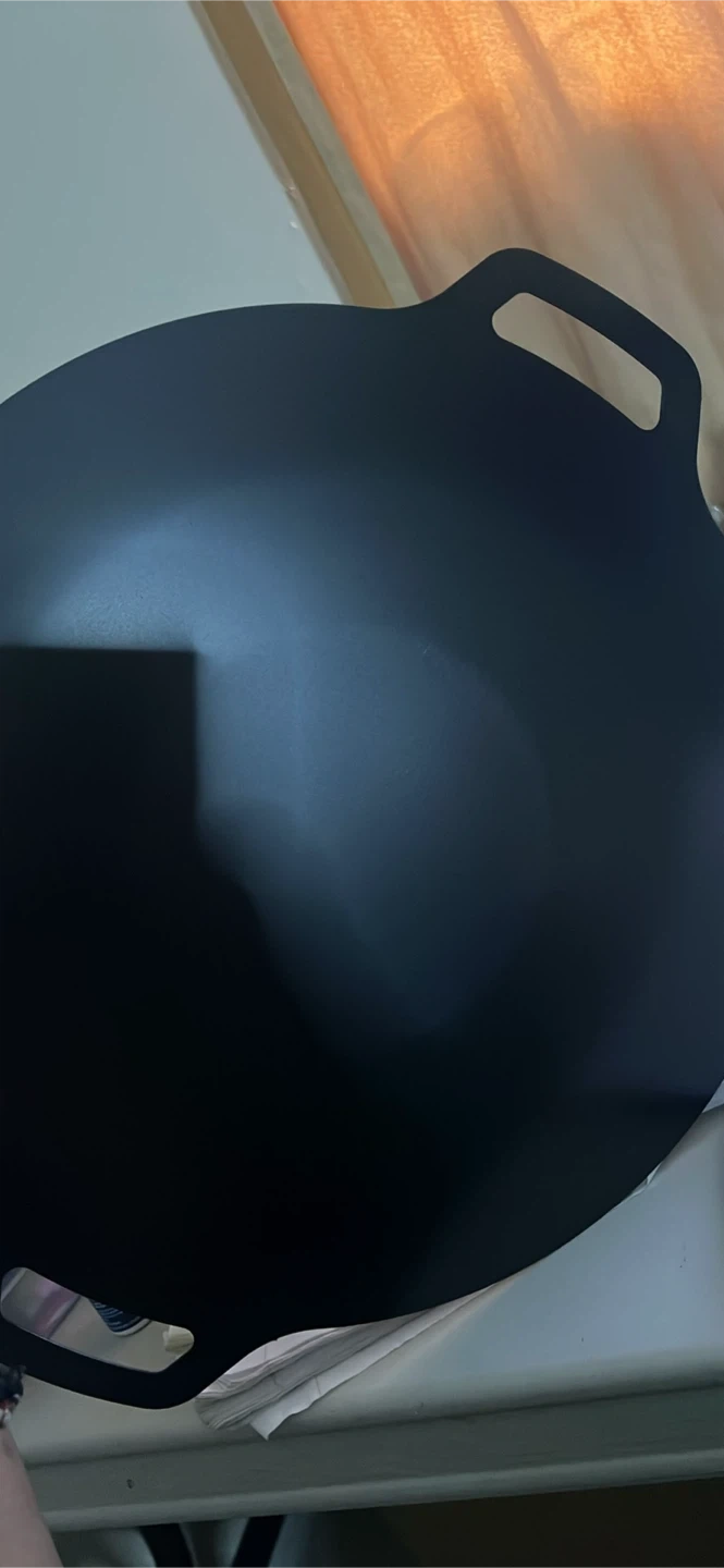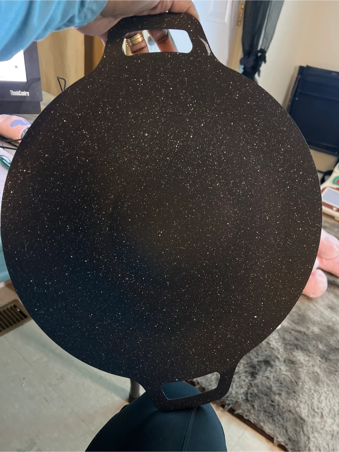 This is a round griddle pan with two integrated handles. It has a speckled black non-stick surface. Perfect for pancakes, quesadillas, and more!