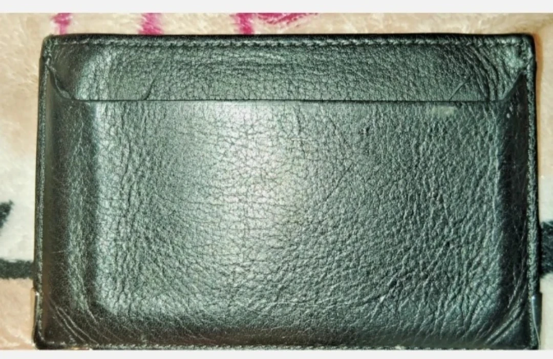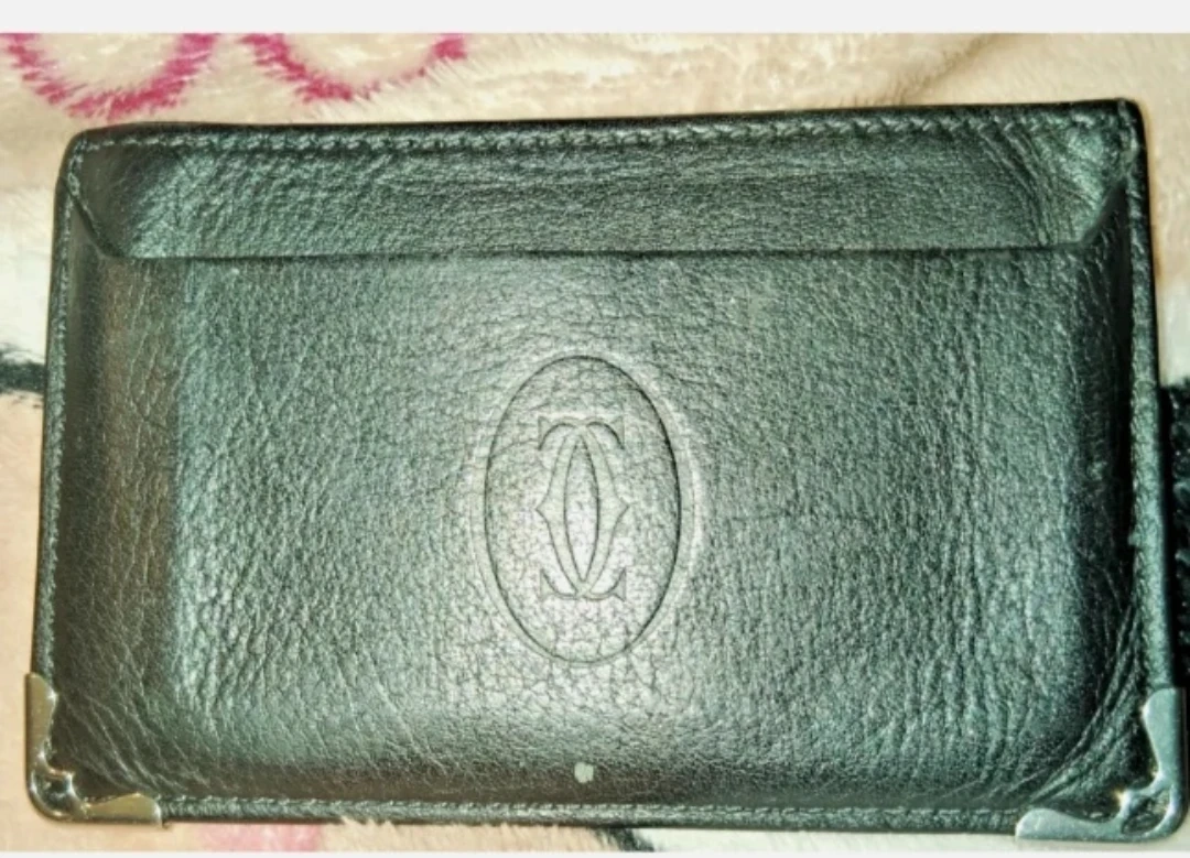 This is a Cartier card holder. It's made of black leather with the iconic Cartier logo embossed on the front. Features reinforced corners.