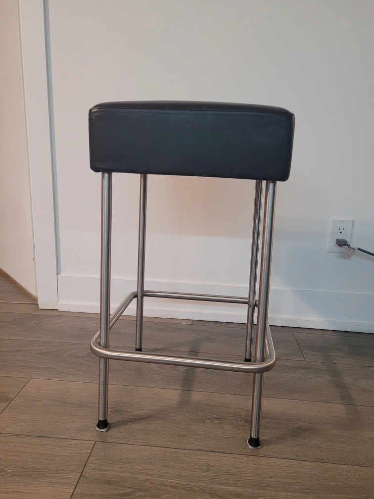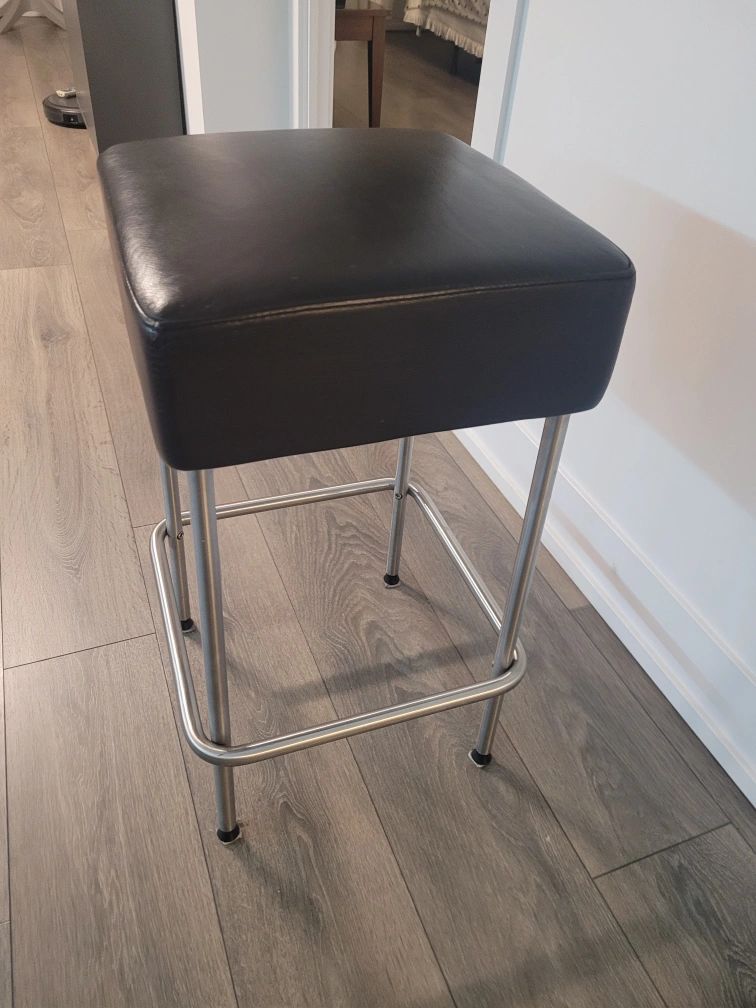 Sleek counter stool. Features a square black leatherette seat and stainless steel legs. Simple design, great for kitchens or bars.