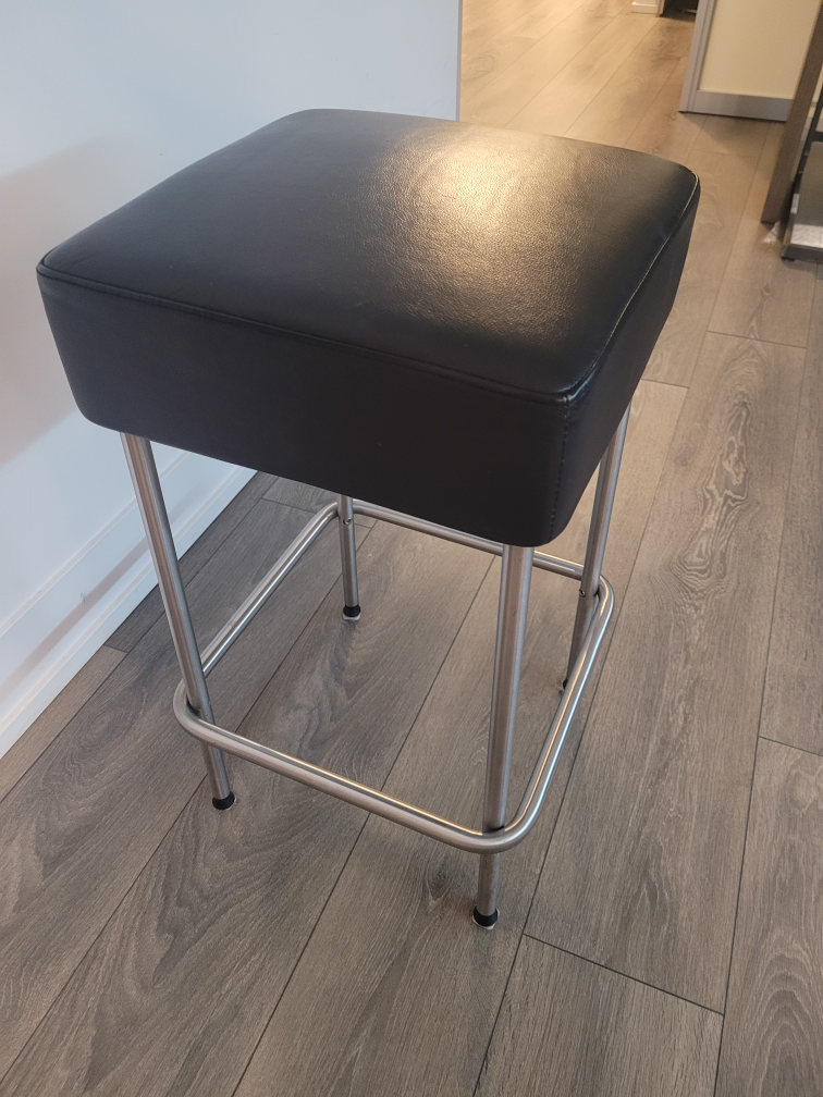 Sleek counter stool. Features a square black leatherette seat and stainless steel legs. Simple design, great for kitchens or bars.