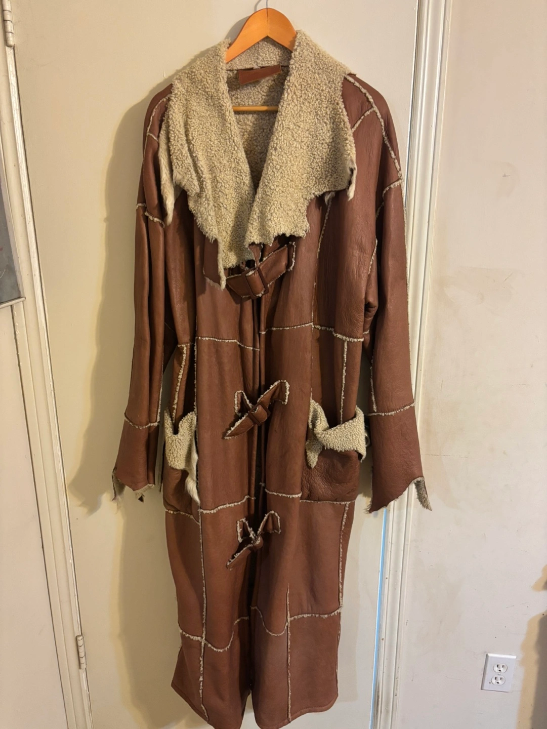 Gorgeous long brown leather coat. Features a shearling collar and pockets. Unique design, patchwork detailing. Tie closures at the front. Excellent condition.