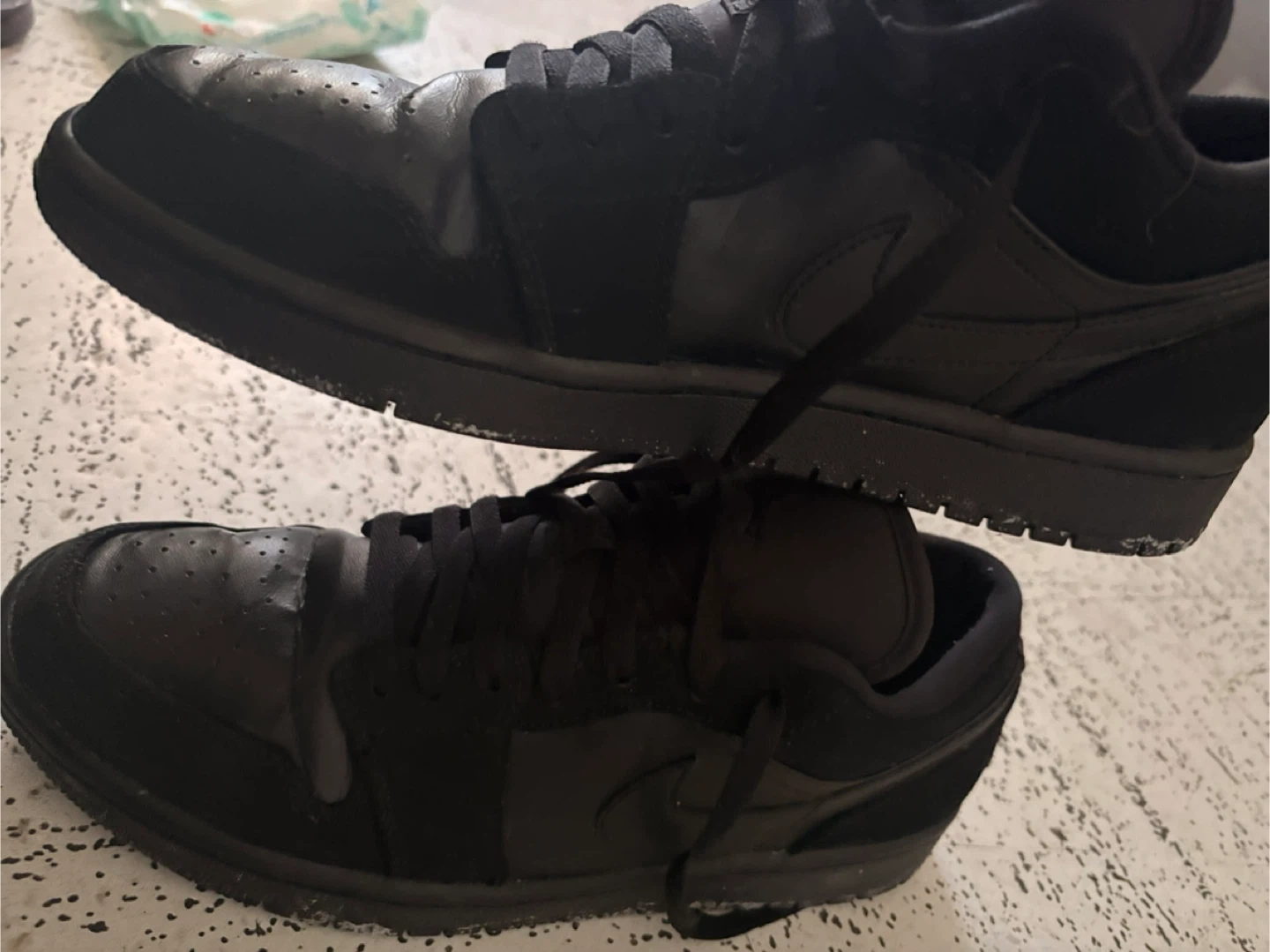 These are Air Jordan 1 Low sneakers in an all-black colourway. They're a size 9.5 US men's. Made in Vietnam.