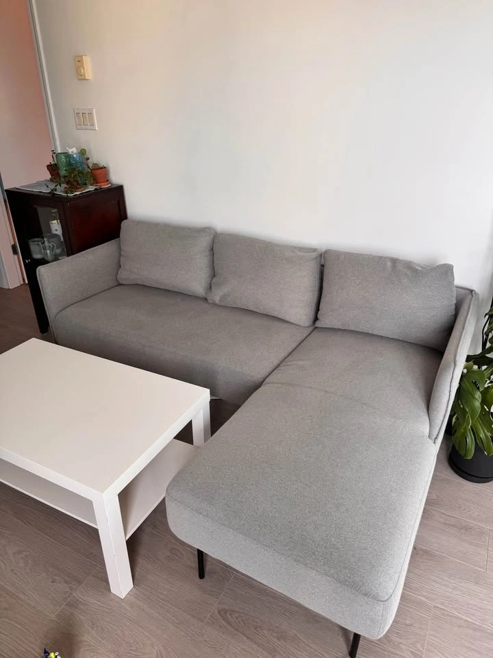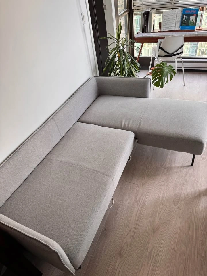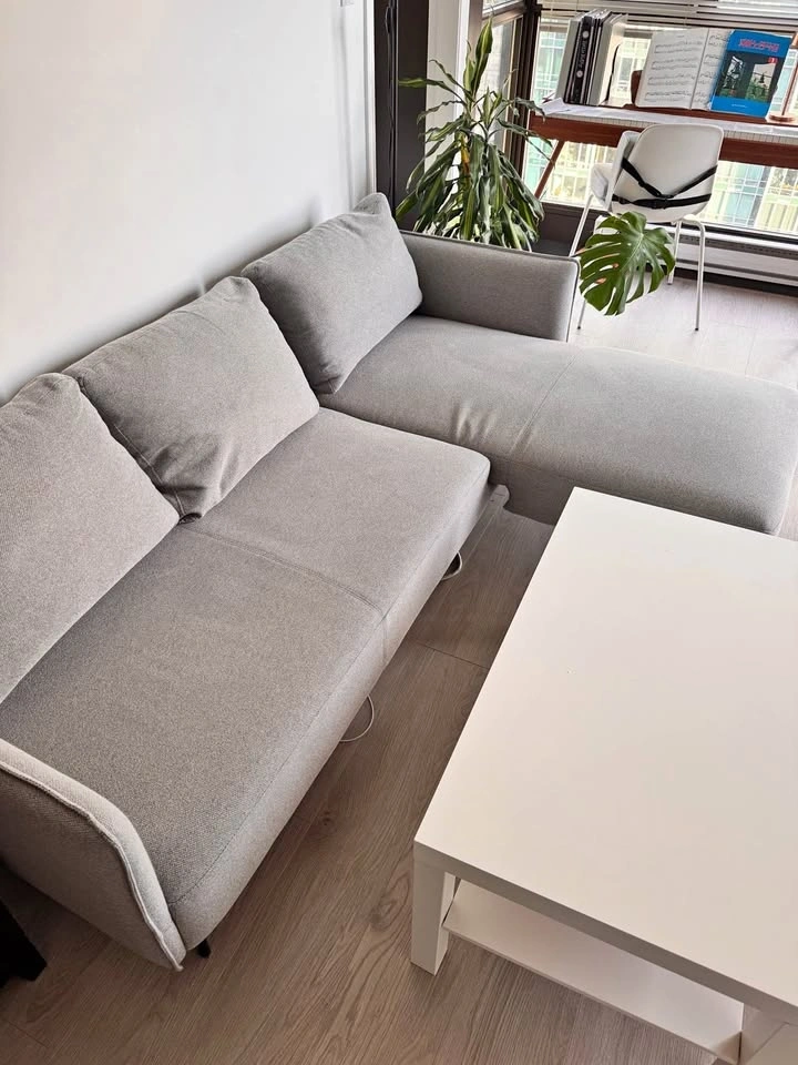 I did so much research and found this couch that’s perfect for my small apartment. Now I’m moving to a new place and looking for a new owner for this couch! The back cushions are detached, so you can remove them for napping, etc. Approximately 192 cm (75.6") in width and 138 cm (54.3") in depth (chaise side). From a no pet, no smoke house. Pick up only in Coal Harbour.
