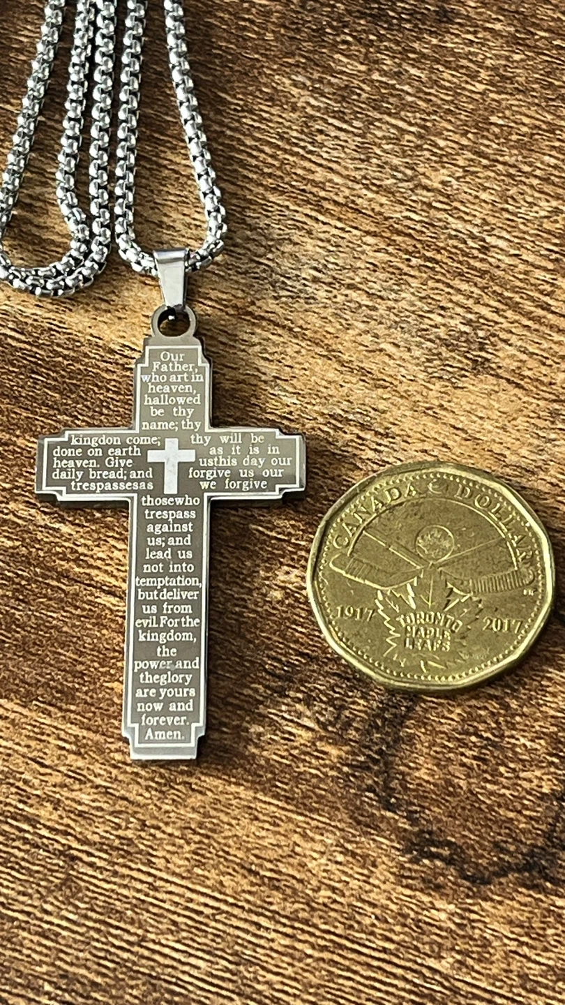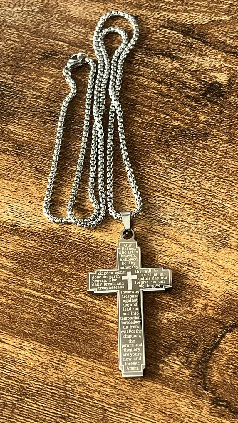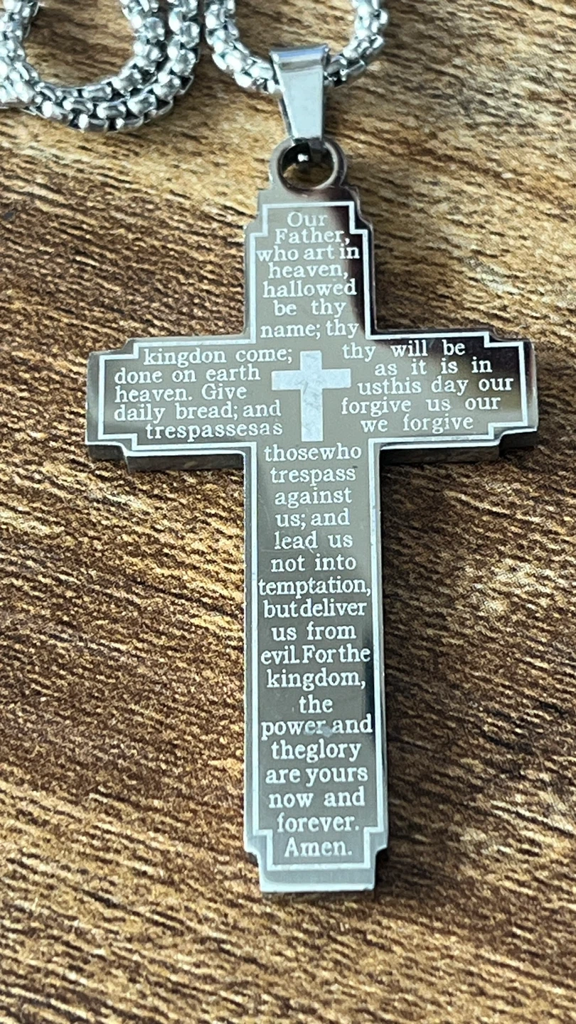 Stainless steel cross necklace engraved with the Lord's Prayer. It features a durable chain and a detailed engraving of the prayer. This necklace is a thoughtful accessory for daily wear.