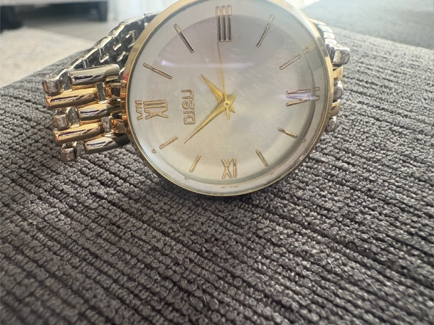 This is a DISU watch with a two-tone metal band. It features a classic white dial with Roman numerals and gold-tone hands. It's a stylish accessory for everyday wear.