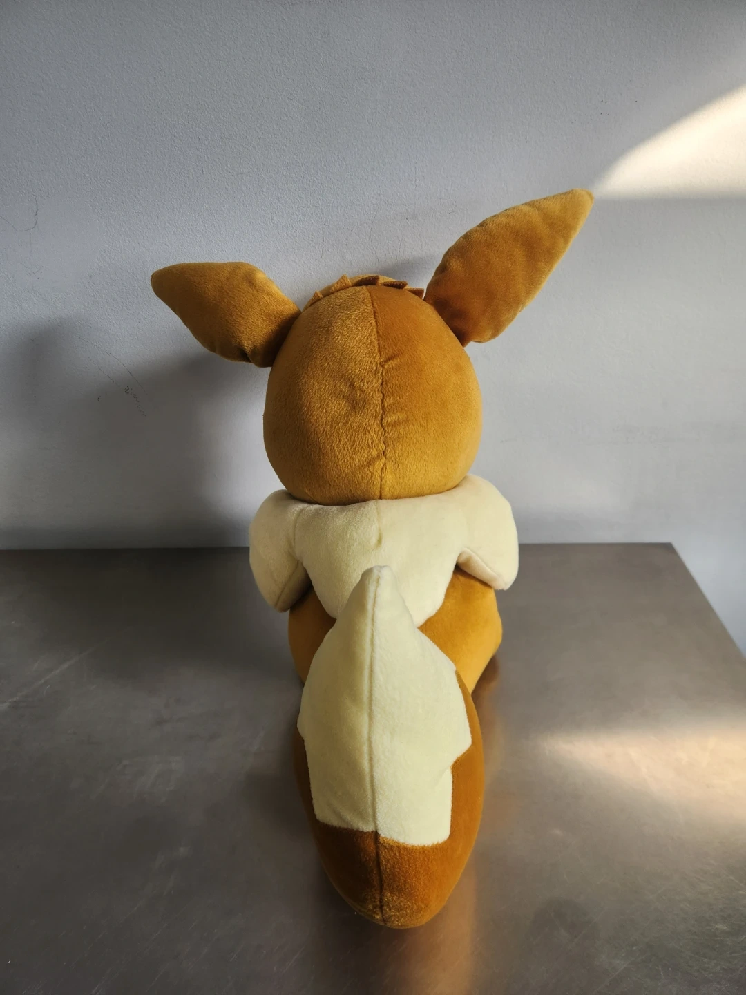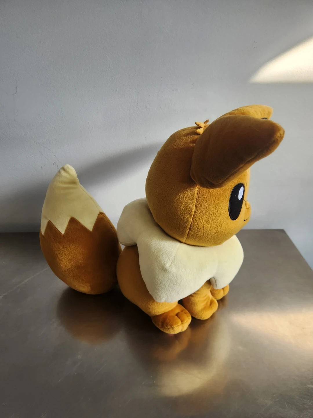 This is a soft Eevee plush toy. It's brown with a cream-coloured ruff and tail accents. A fun companion for any Pokemon fan!