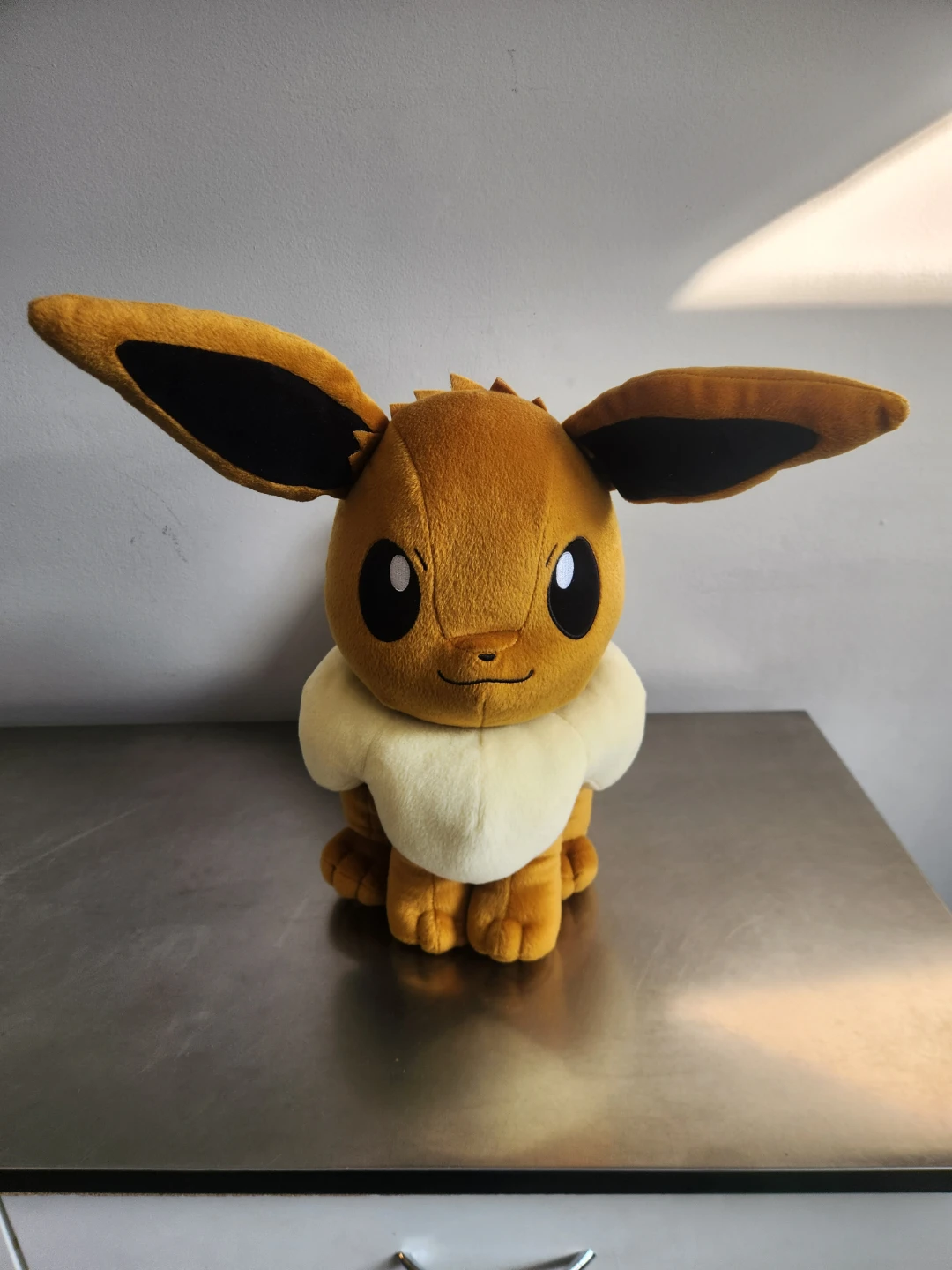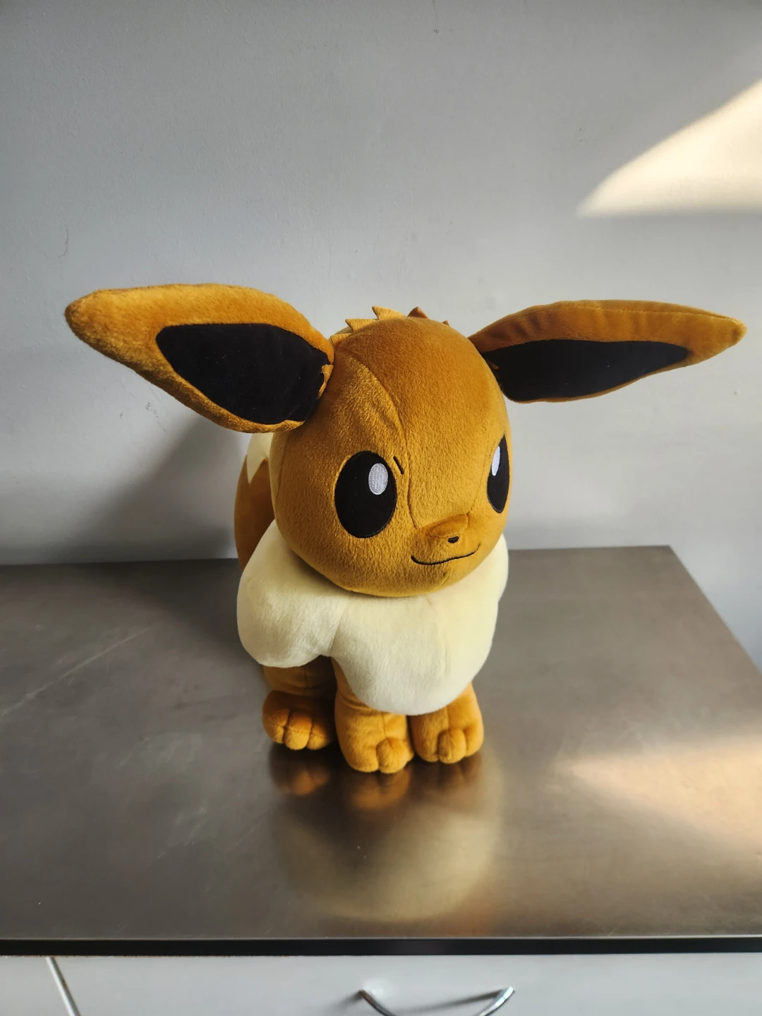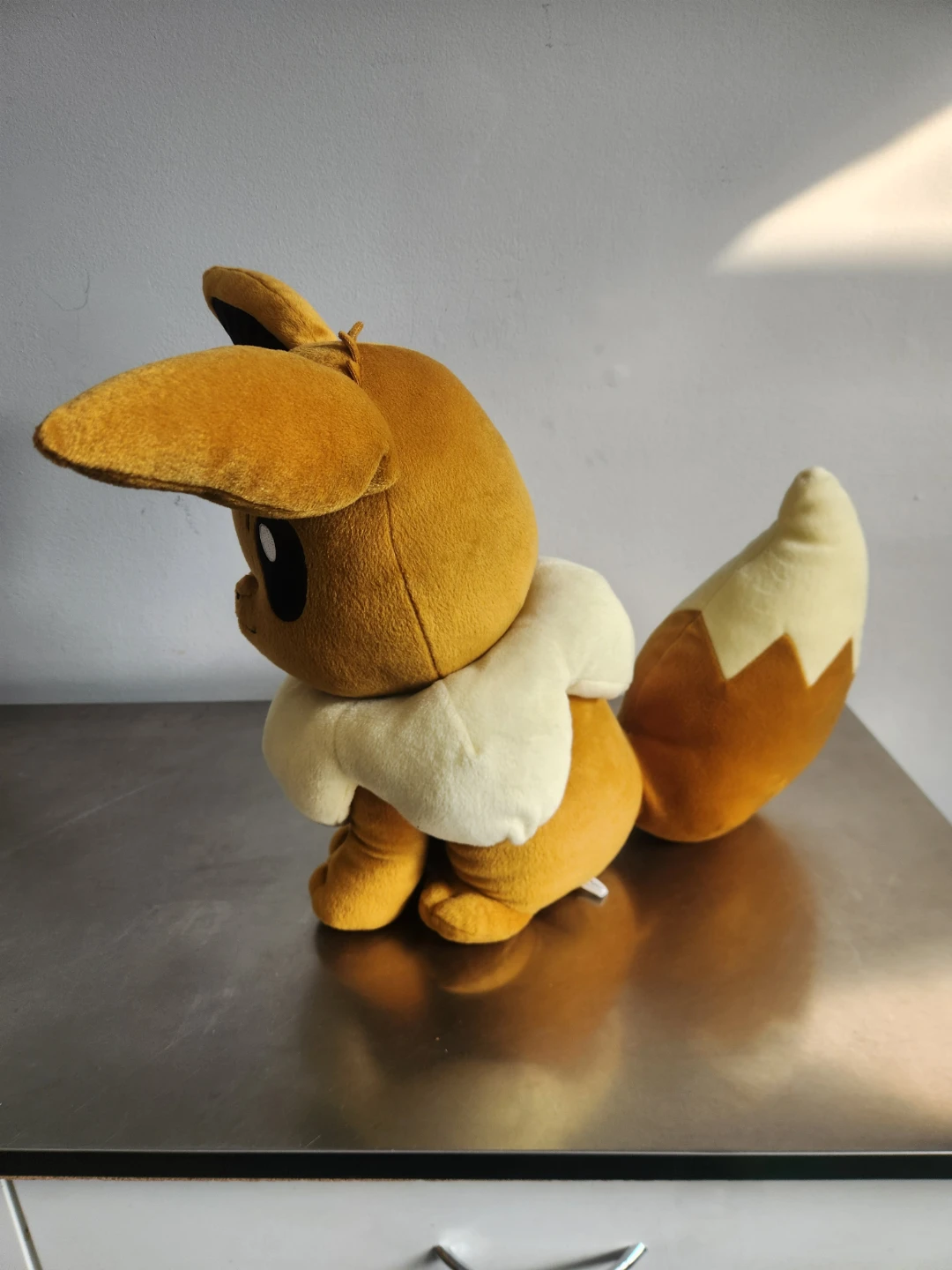 This is a soft Eevee plush toy. It's brown with a cream-coloured ruff and tail accents. A fun companion for any Pokemon fan!