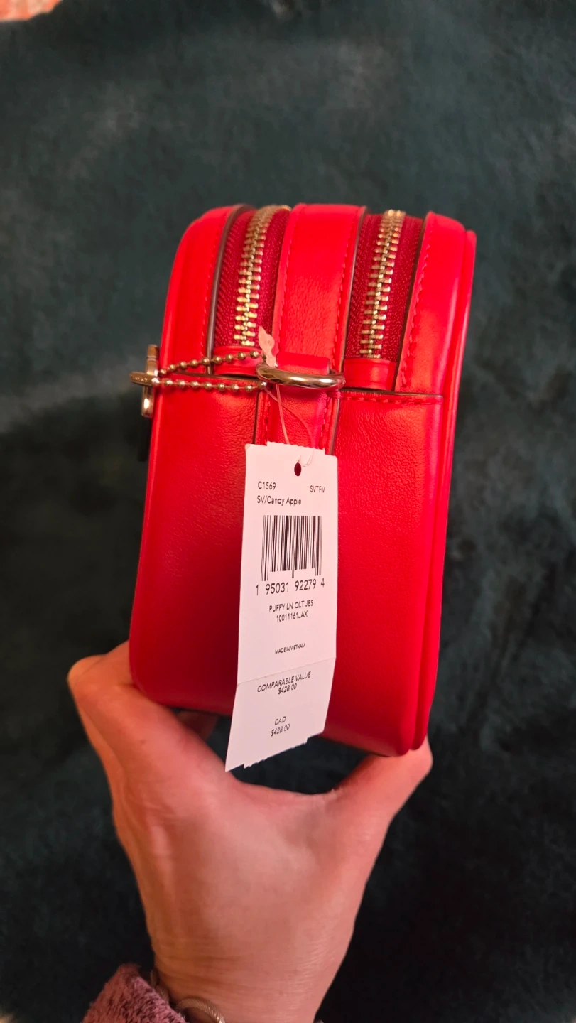 This is a Coach crossbody purse in a puffy quilted design. It's a vibrant apple red colour with silver hardware. This purse is great for carrying essentials when you're on the go!