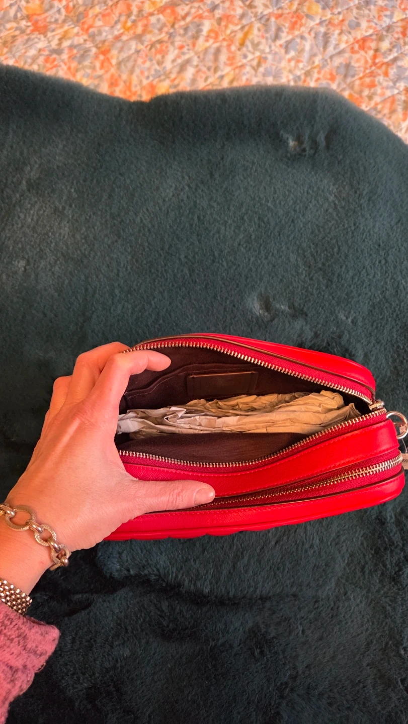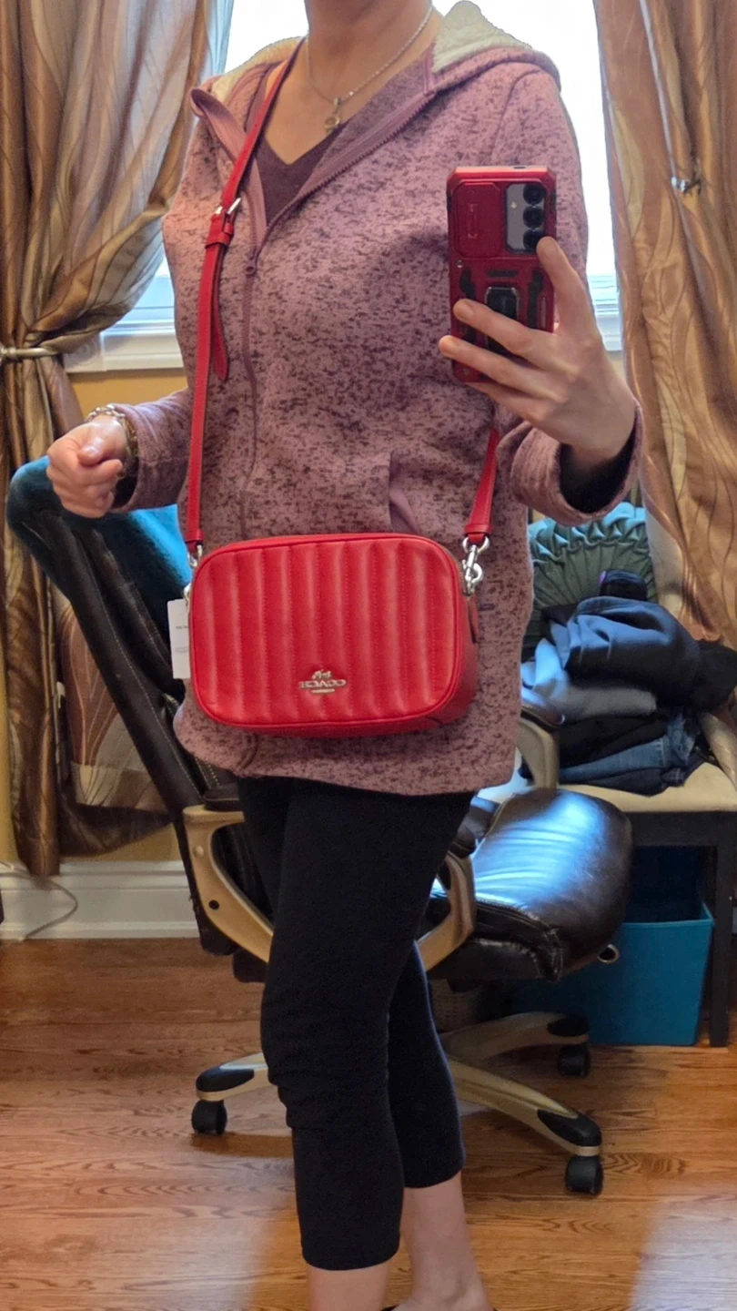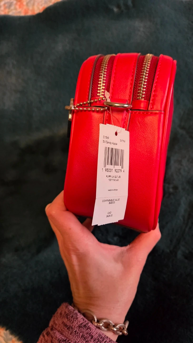 This is a Coach crossbody purse in a puffy quilted design. It's a vibrant apple red colour with silver hardware. This purse is great for carrying essentials when you're on the go!