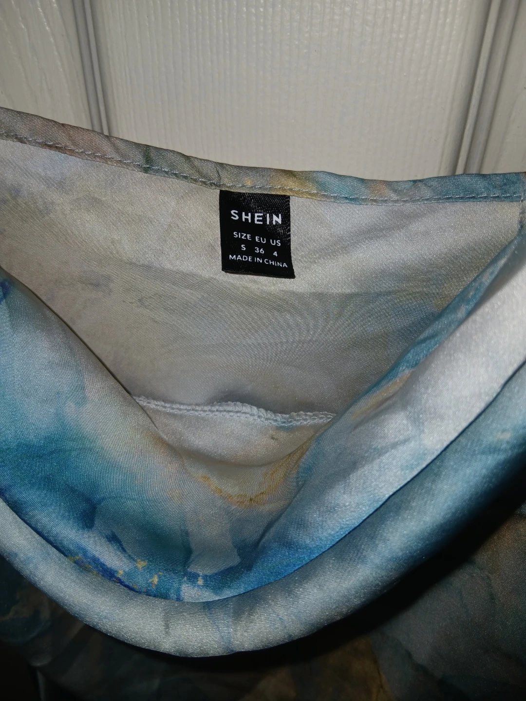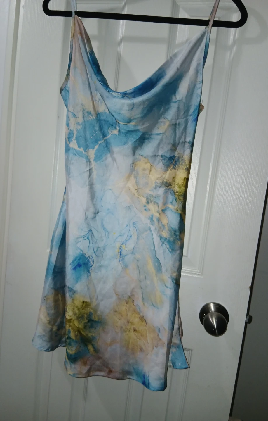 This SHEIN slip dress features a cool marble print in blue and gold. It's a size small with adjustable straps and a cowl neckline. Perfect for a night out or a special occasion!