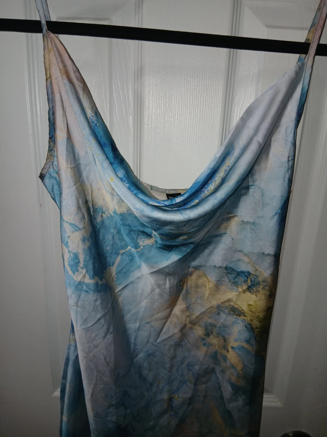 This SHEIN slip dress features a cool marble print in blue and gold. It's a size small with adjustable straps and a cowl neckline. Perfect for a night out or a special occasion!