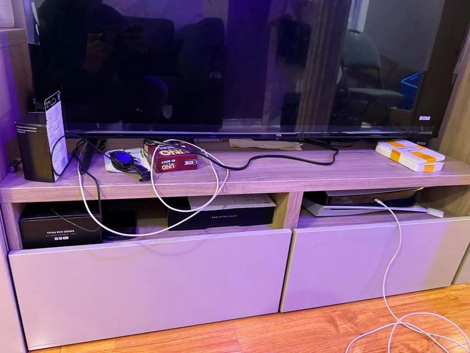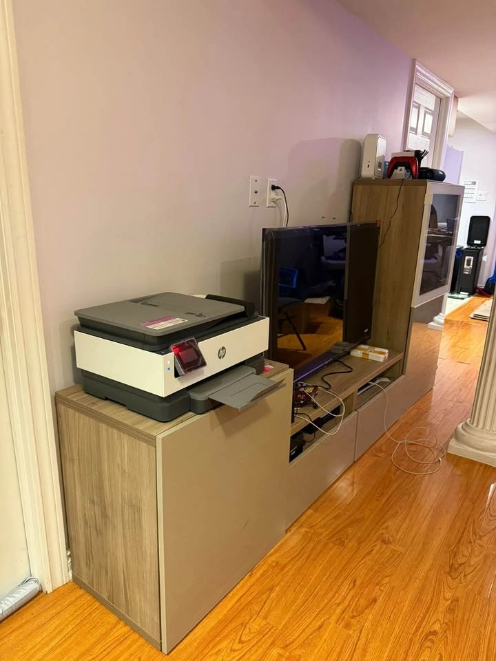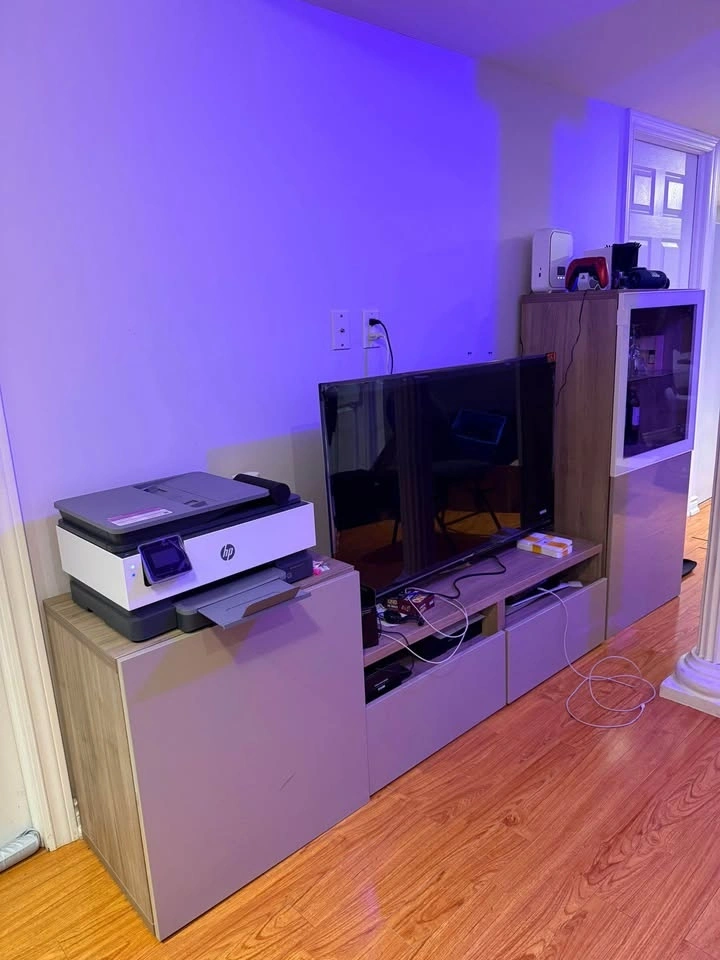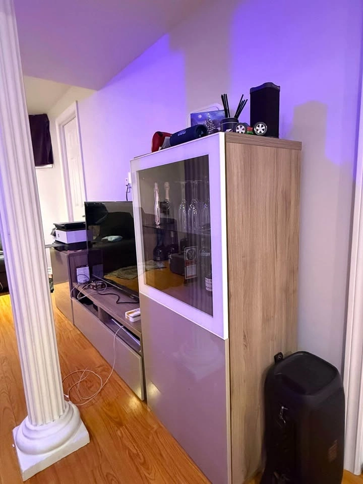Amazing condition 3 piece entertainment stand. Comes with tv stand and two cupboards that can be used for any purpose. One is currently used as a bar for wines, glasses etc and the other to store documents. No chips or cracks.