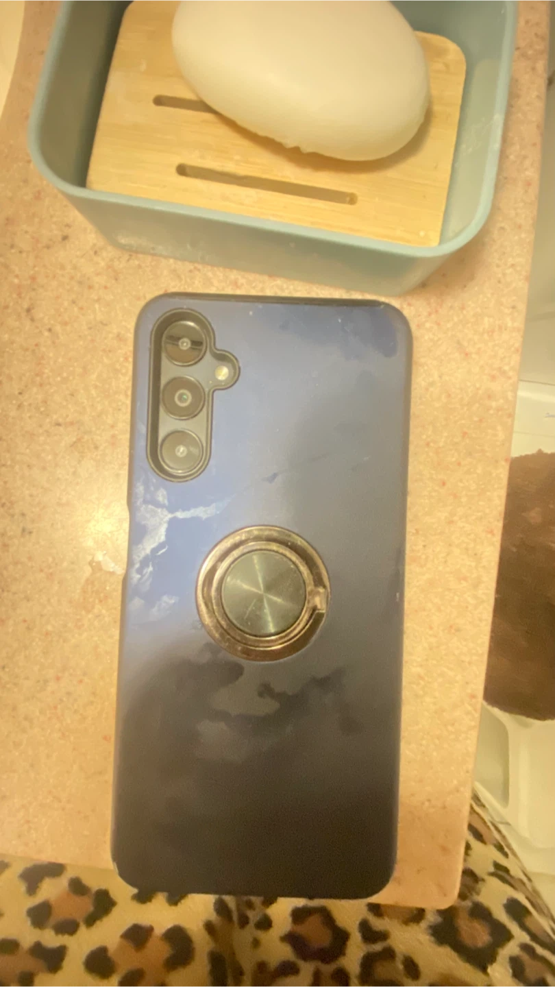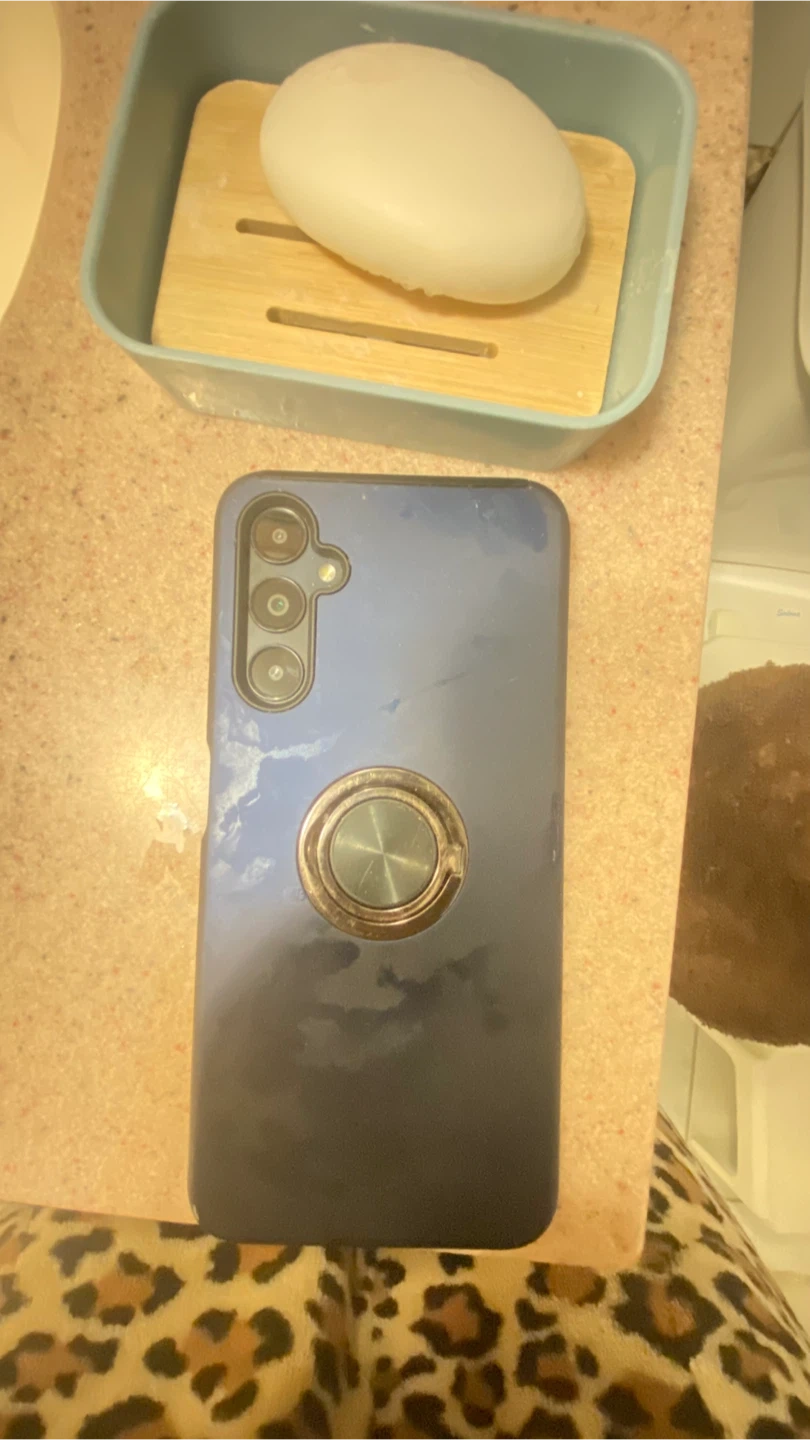 This Samsung Galaxy A13 smartphone has a 5000 mAh battery. It features a triple camera setup on the back. A ring holder is attached to the back for easier handling.
