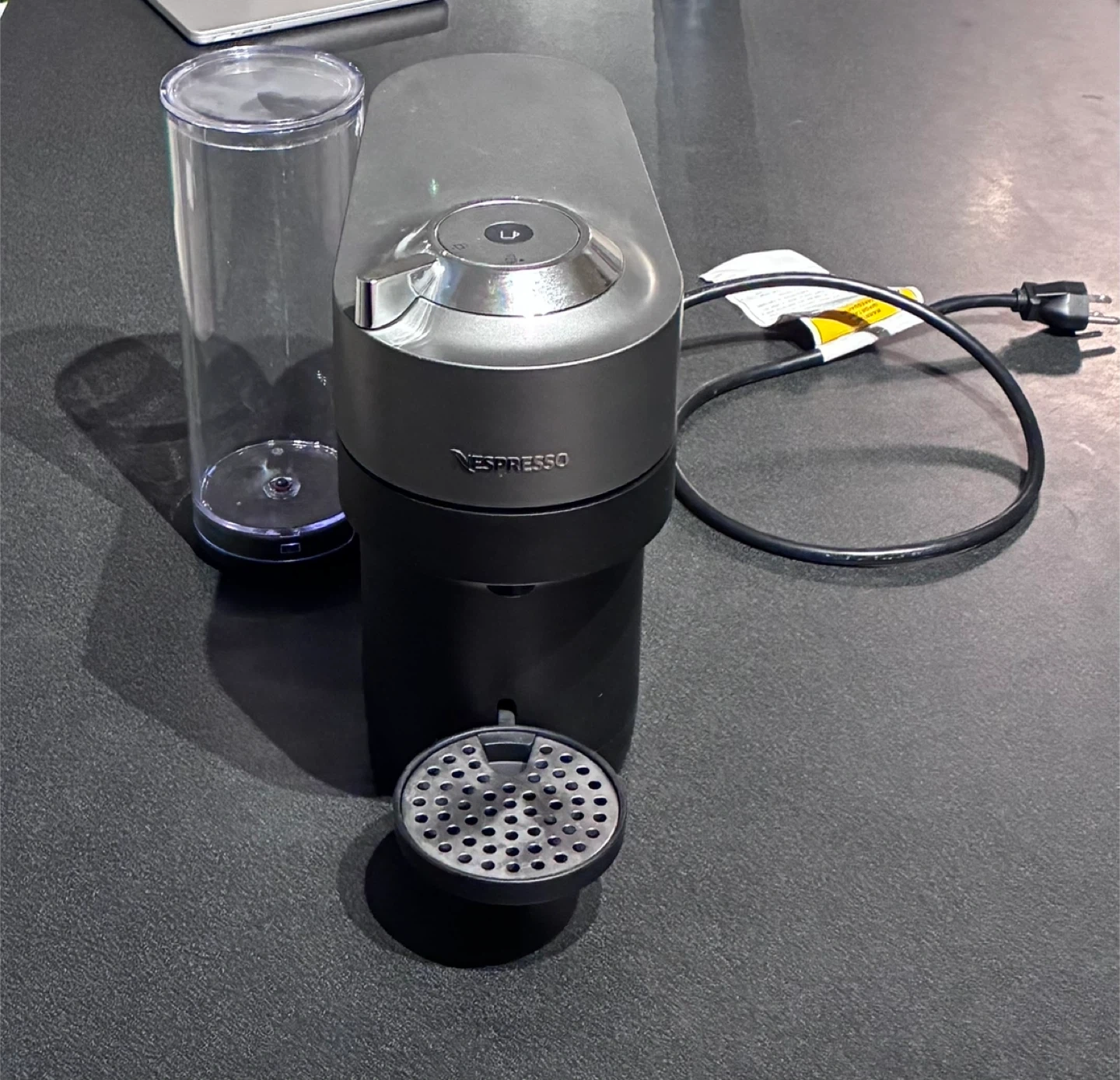 This Nespresso Vertuo Pop+ Deluxe coffee machine comes in Titan colour. It's Nespresso's smallest Vertuo model. Includes the coffee machine, water reservoir, and drip tray.