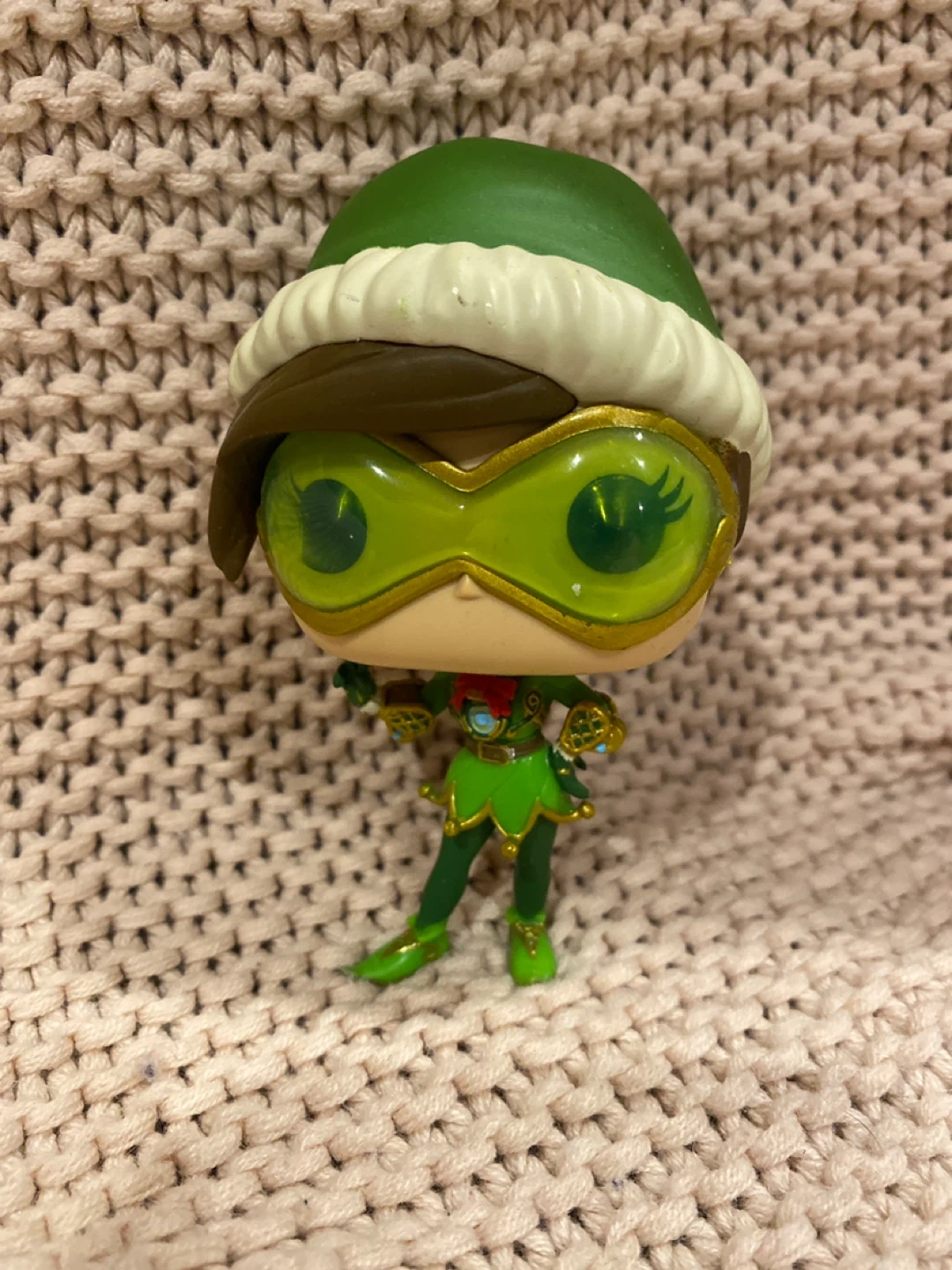 This is a Funko Pop! DC Bombshells Mera collectible figure. It's green with a festive holiday hat. Perfect for any DC Comics fan!