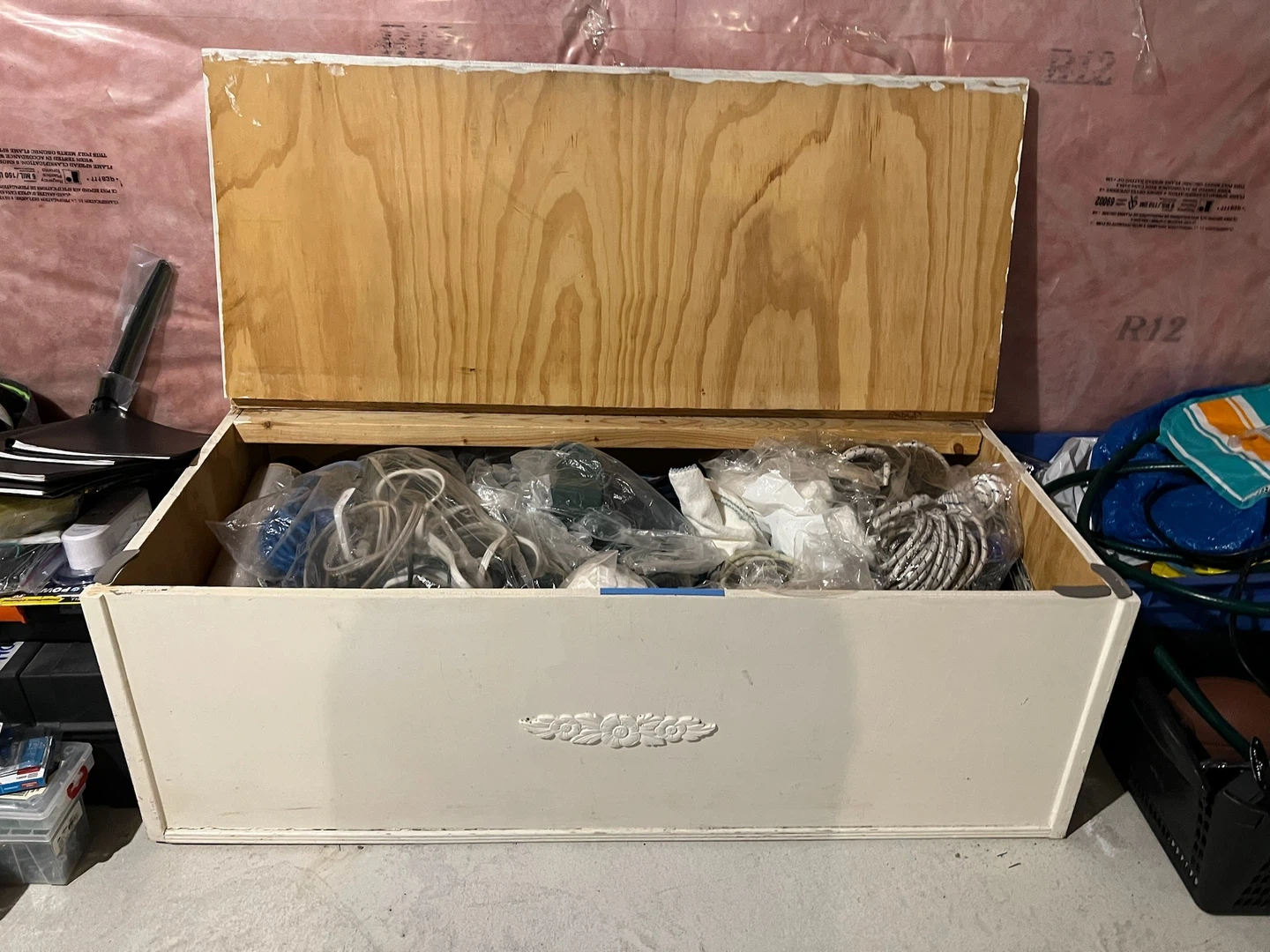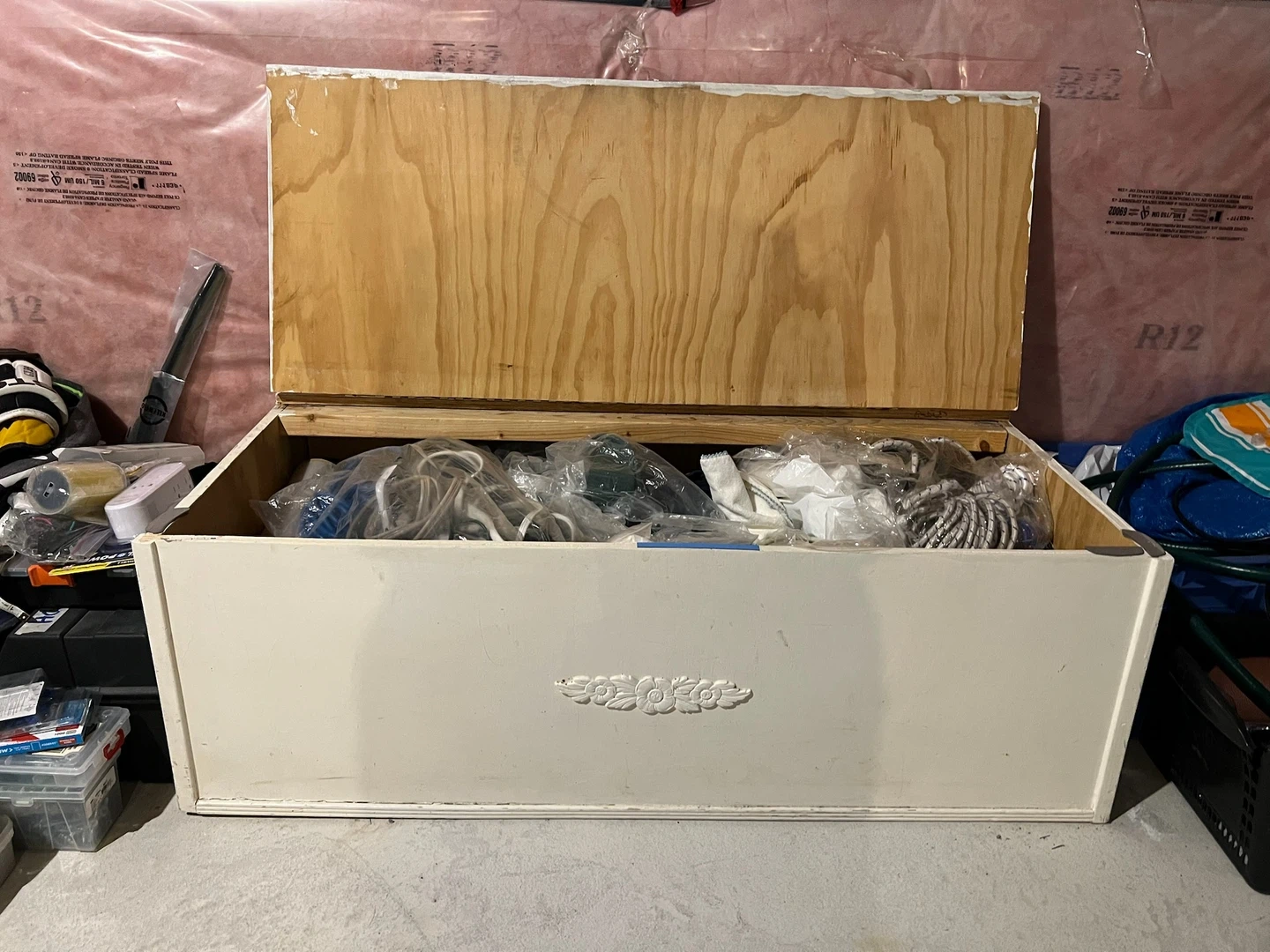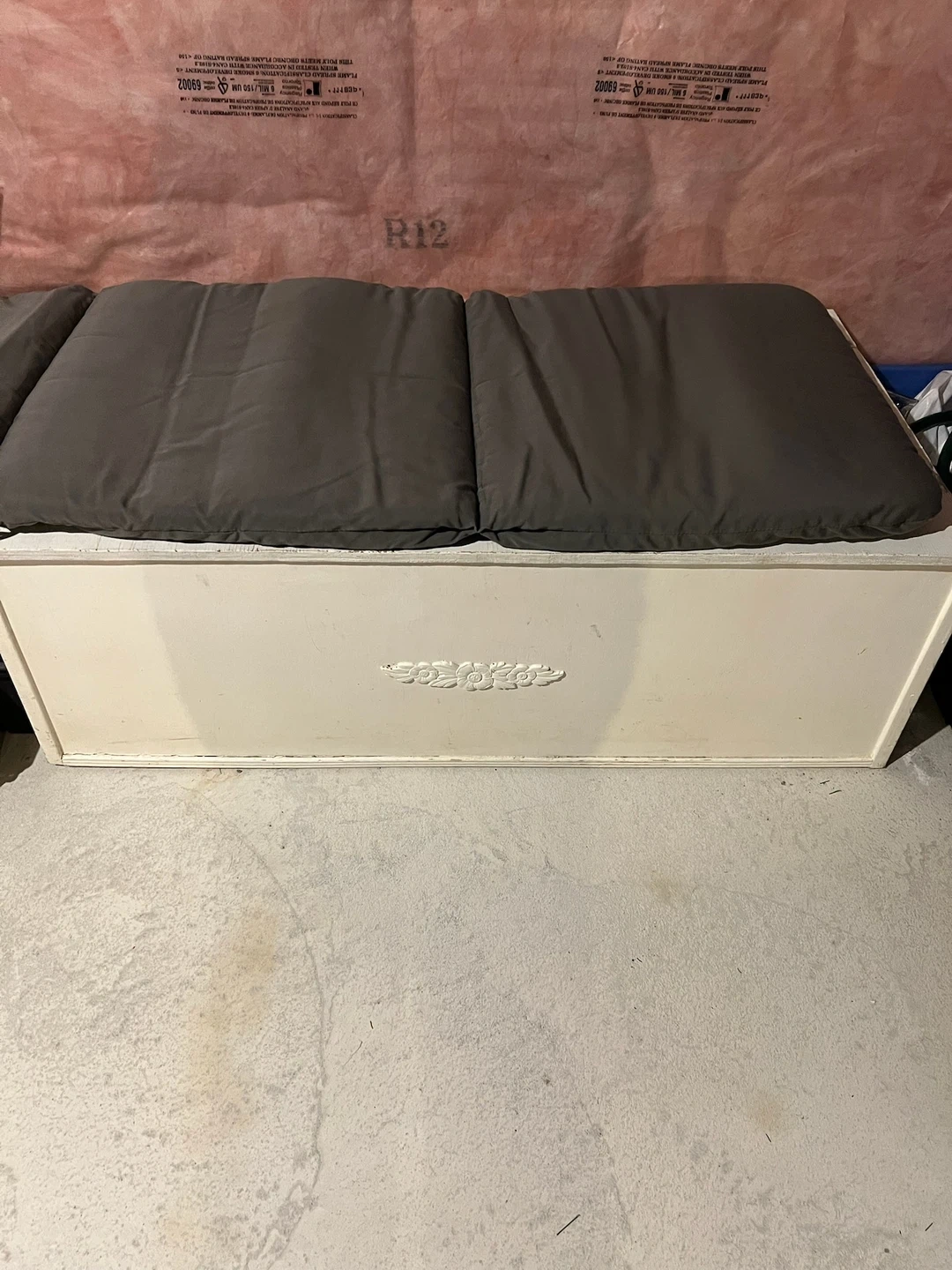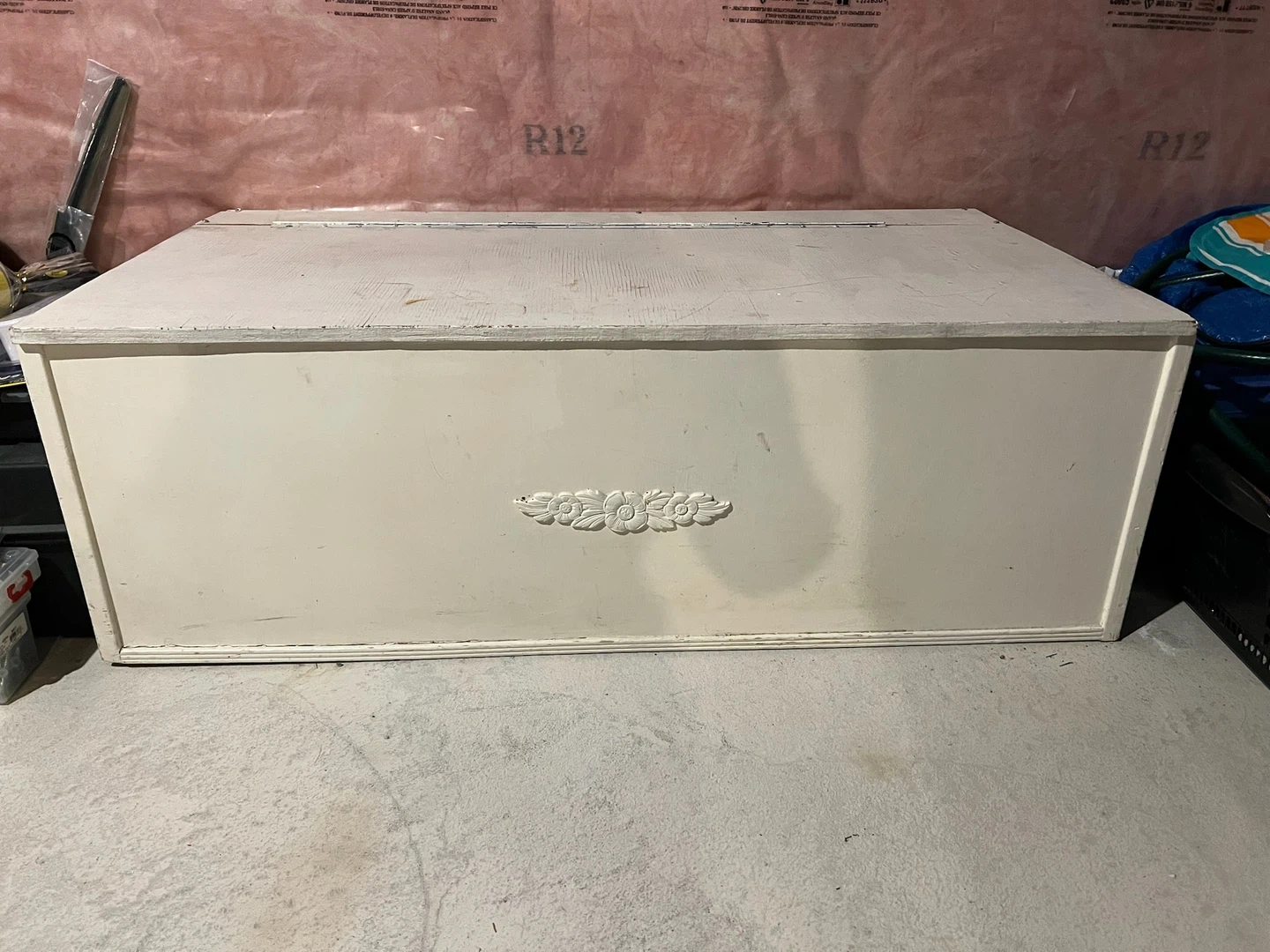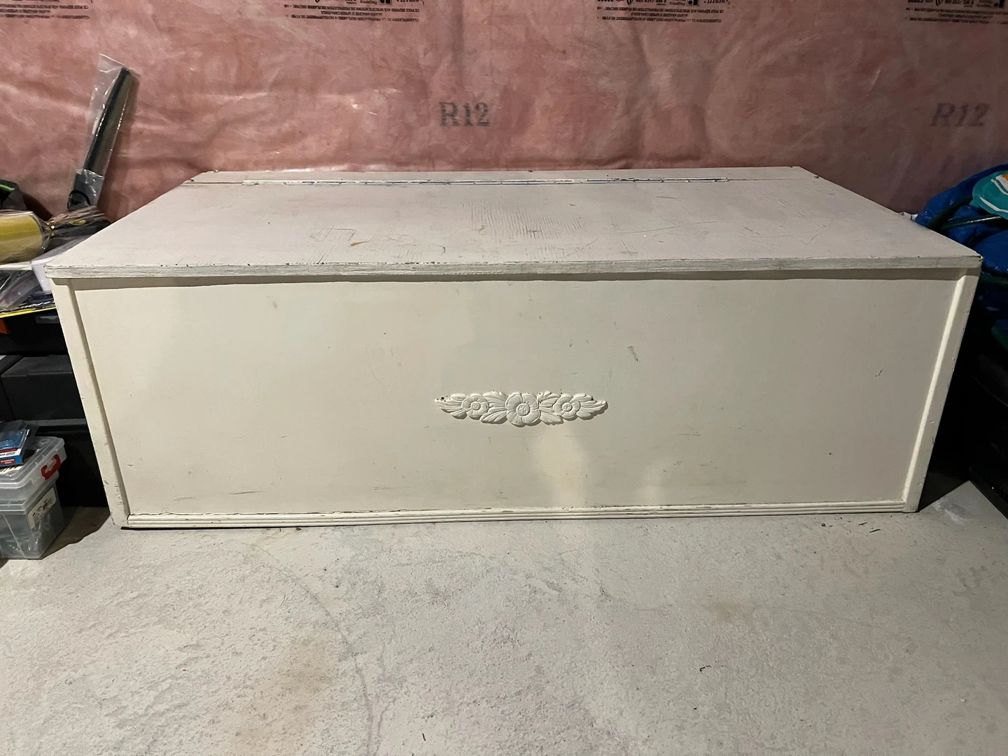 A vintage-style white wooden storage chest with a decorative front panel. It's great for storing blankets, toys, or seasonal items. The interior is lined with natural wood.