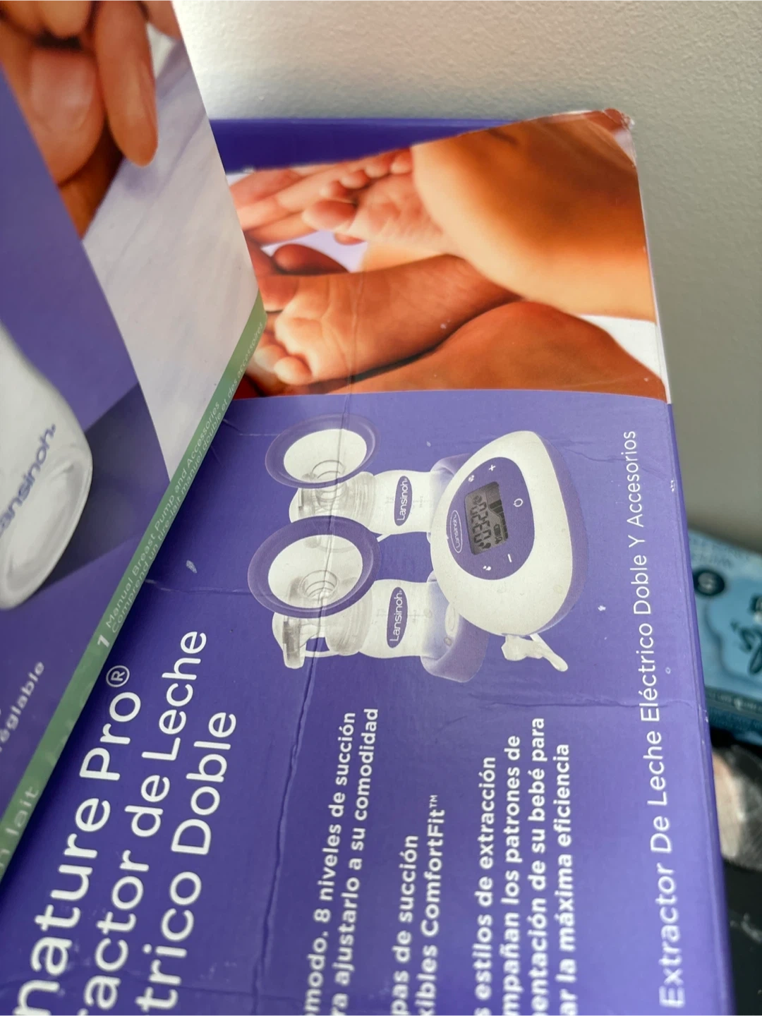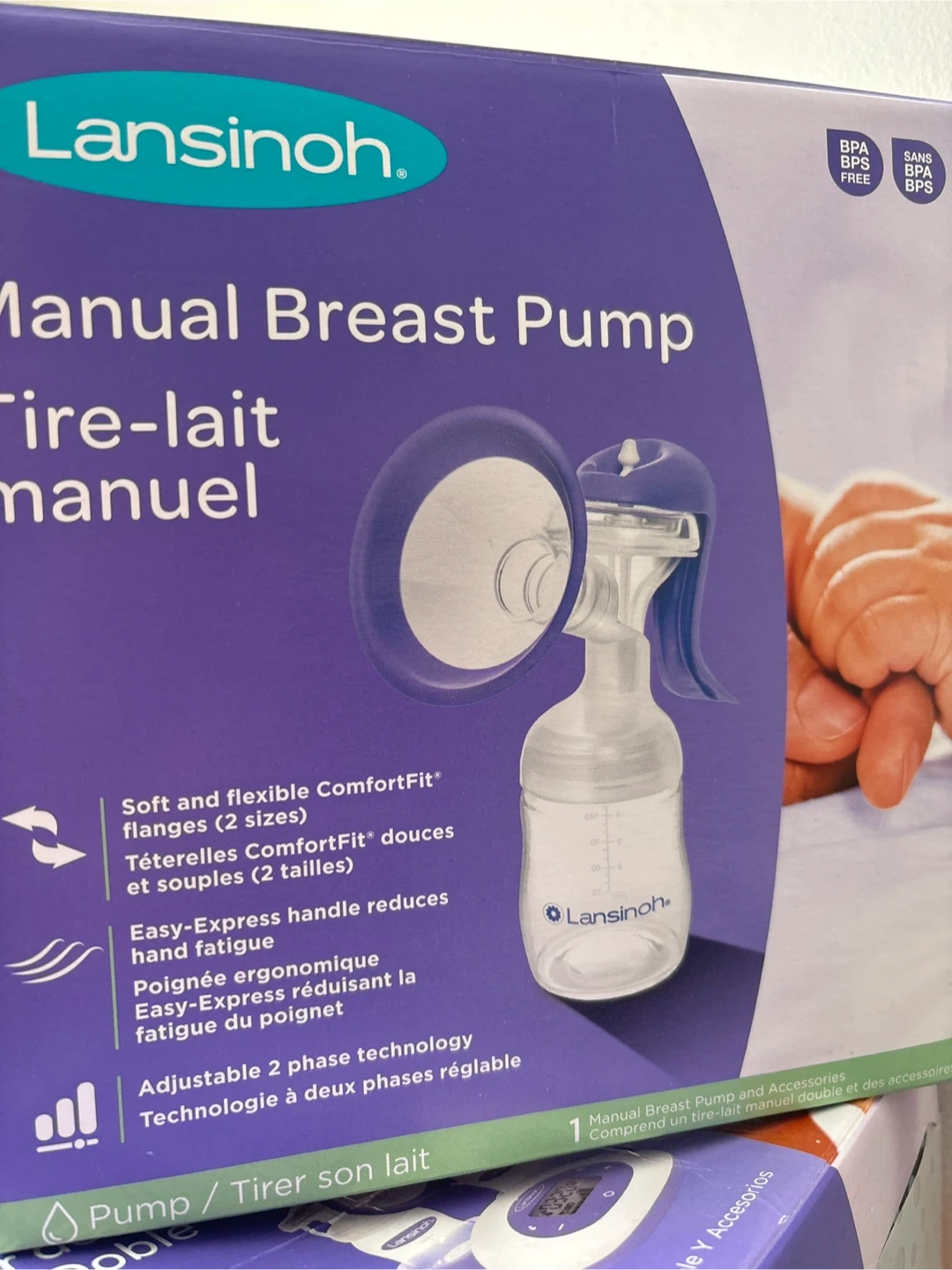 Selling two Lansinoh breast pumps: a manual and a Signature Pro Double Electric model. Both pumps feature ComfortFit flanges for a comfortable fit. The electric pump offers adjustable suction levels.