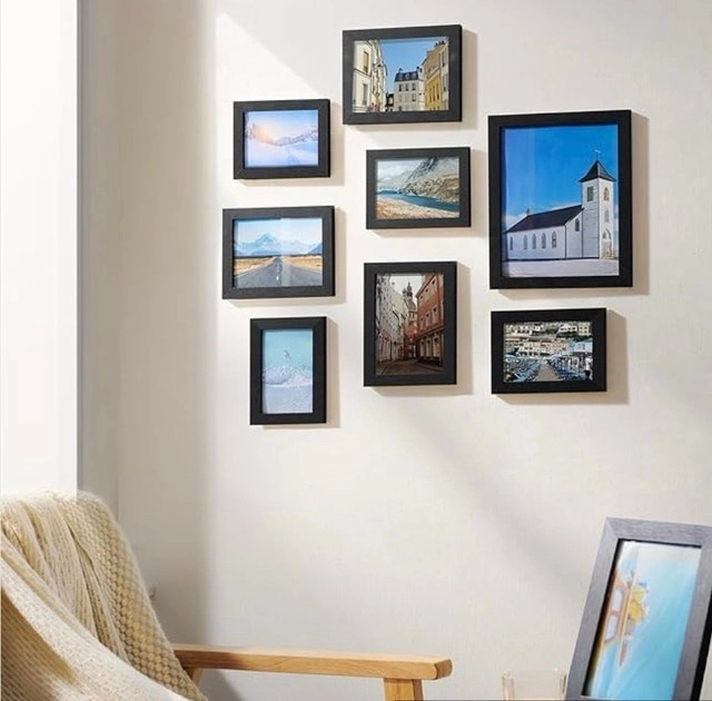 Complete black picture frame set for a gallery wall. Has 10 frames total. Comes with: 4 frames 4x6 inch, 4 frames 5x7 inch, and 2 frames 8x10 inch. Perfect for creating a cool photo display.