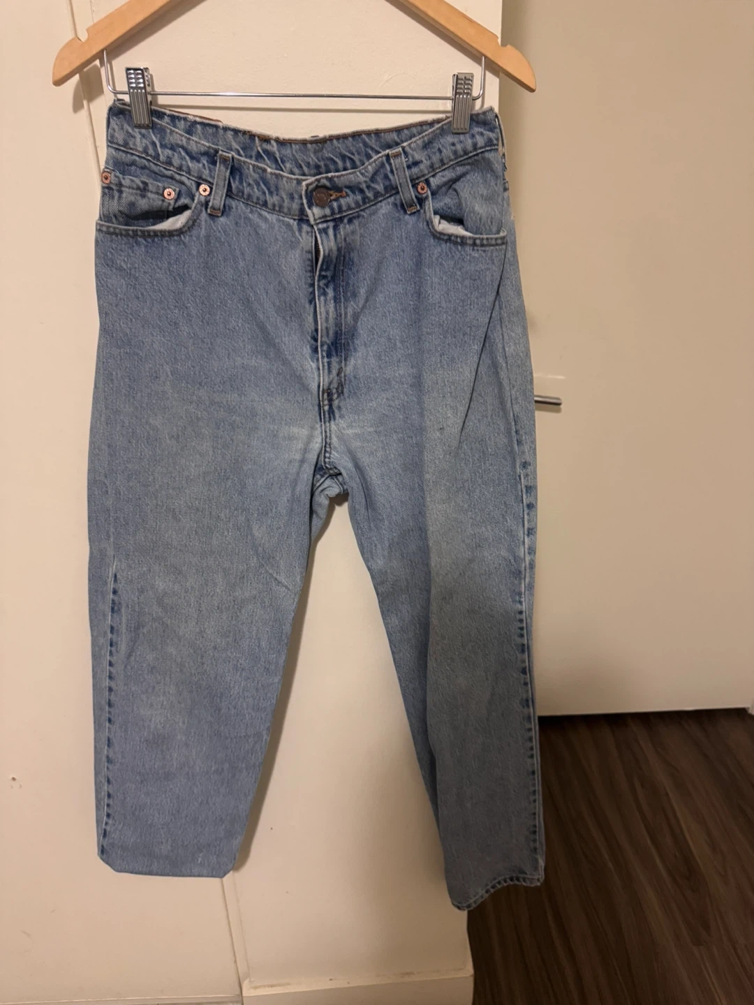 These are light wash Levi's women's 550 jeans. They're a relaxed fit with a straight leg. Cotton denim material.
