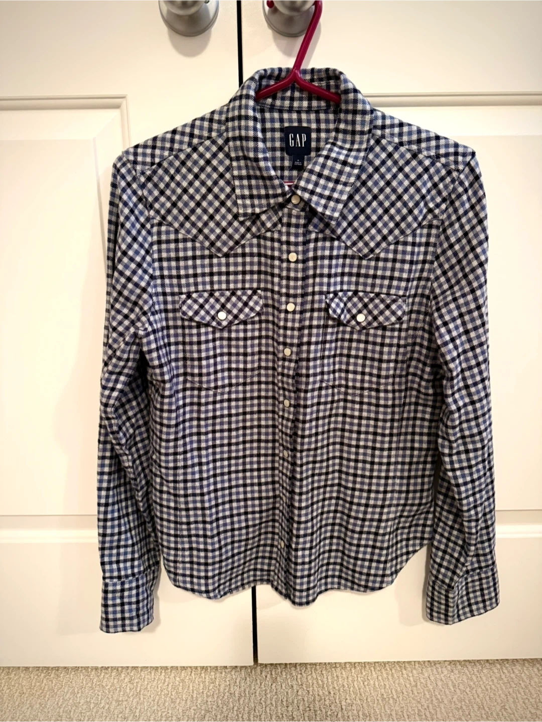 Here's a cute GAP plaid western style shirt! It features a classic blue and white checkered pattern and has two front pockets and Snap buttons. Plus Never worn. Didn’t like how it looked on me.