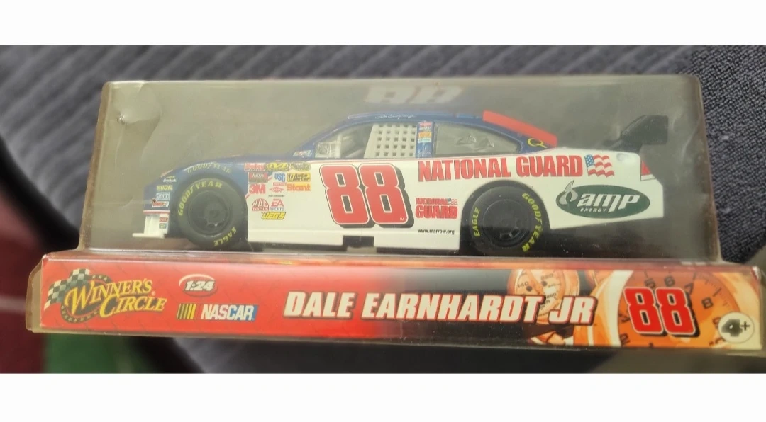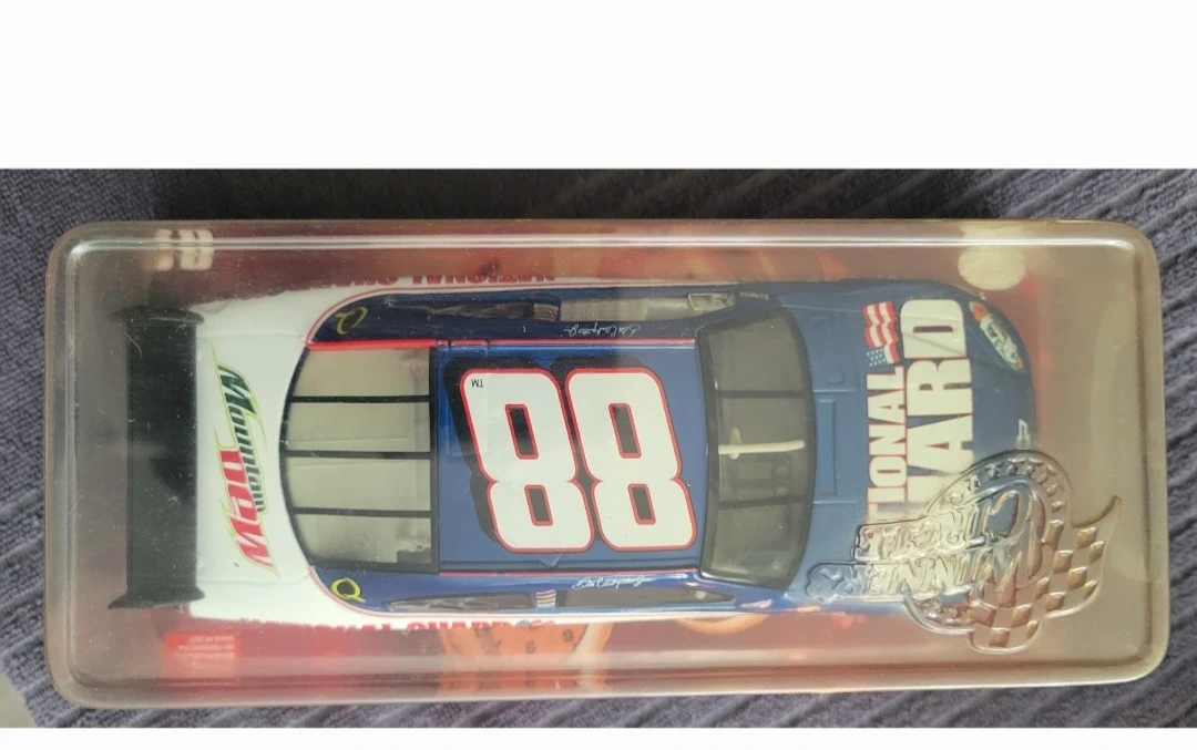This is a 1:24 scale die-cast race car featuring Dale Earnhardt Jr.'s #88 National Guard car. It's in its original packaging. A great collectible for NASCAR fans!