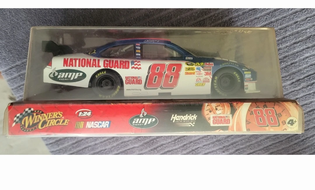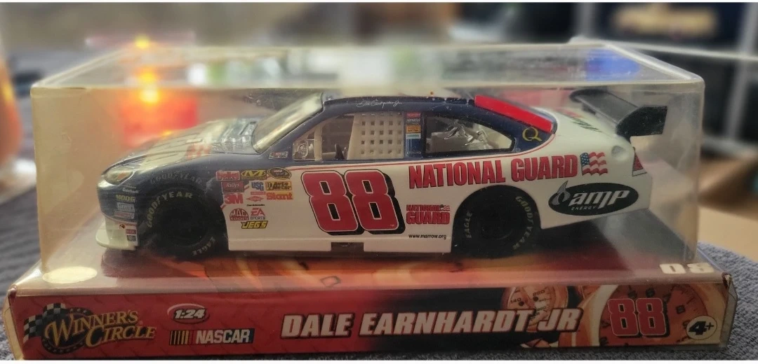 This is a 1:24 scale die-cast race car featuring Dale Earnhardt Jr.'s #88 National Guard car. It's in its original packaging. A great collectible for NASCAR fans!