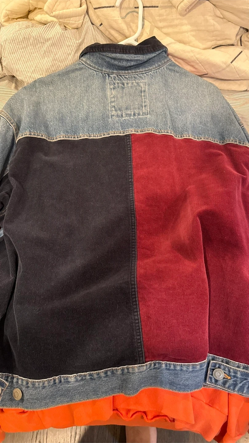 Tommy Hilfiger denim jacket with a colorblock design. Features corduroy accents on the jacket and pants. It’s a set