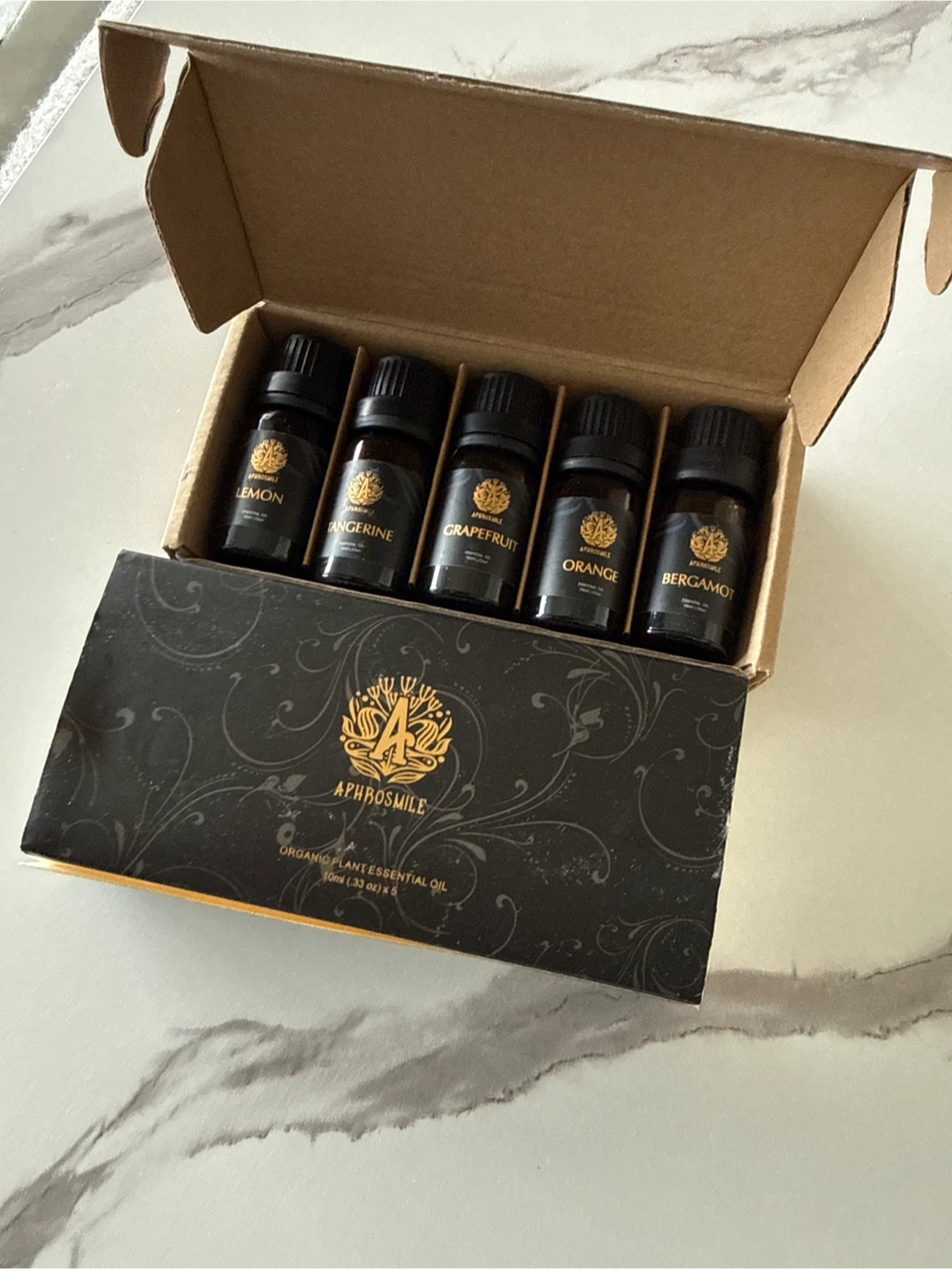 A set of Aphrosmile organic plant essential oils! This set includes 4 different scents(Lemon is empty): Tangerine, Grapefruit, Orange, and Bergamot. Each bottle contains 10ml of essential oil. Perfect for aromatherapy or adding a natural fragrance to your home