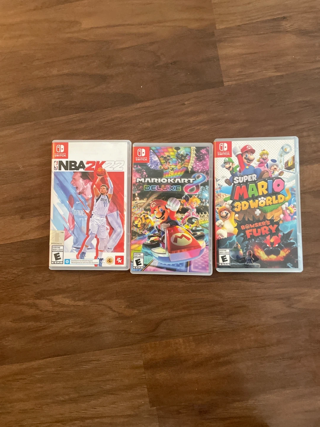 Bundle of three Nintendo Switch games. Includes NBA 2K22, Mario Kart 8 Deluxe, and Super Mario 3D World + Bowser's Fury. All games are rated E for Everyone.