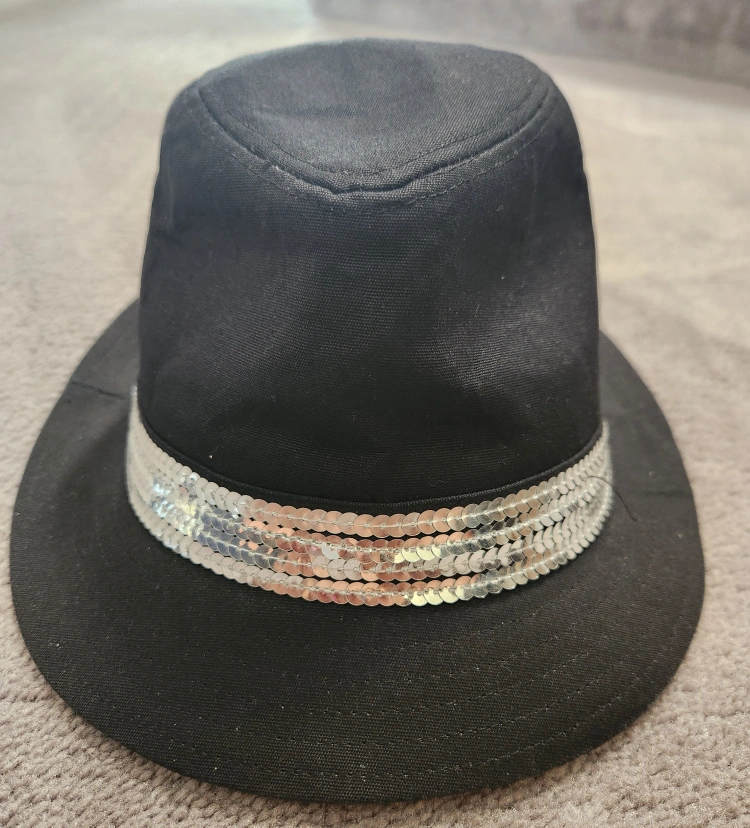 A stylish black fedora with a sparkly sequin band! It's a one-size-fits-most hat, perfect for adding a bit of flair to any outfit. The tag shows it was originally $12.99.