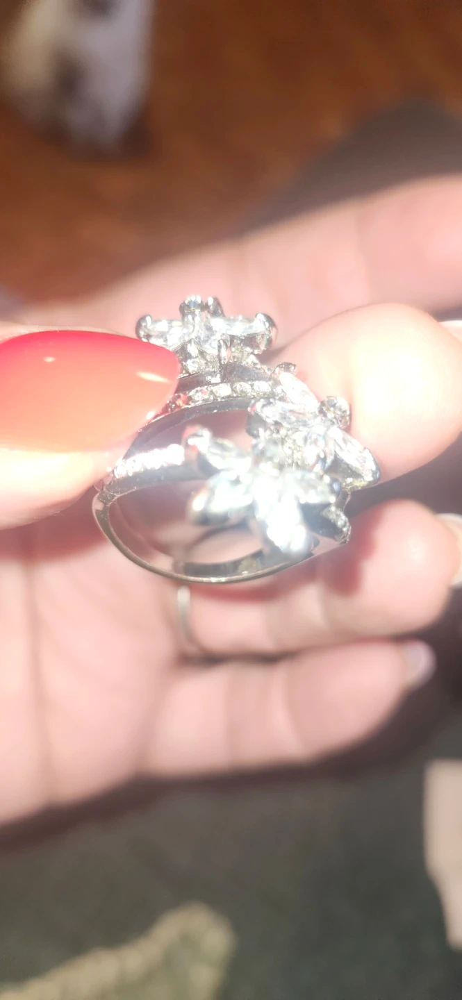 Silver-toned ring with a floral design and clear rhinestones. It features multiple bands and flower accents. Great for adding a bit of sparkle!
