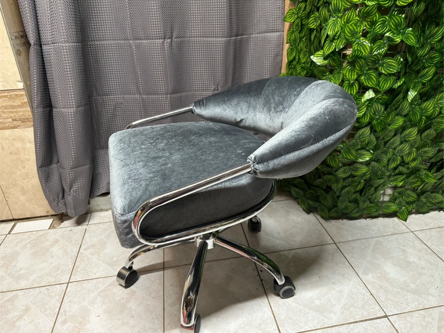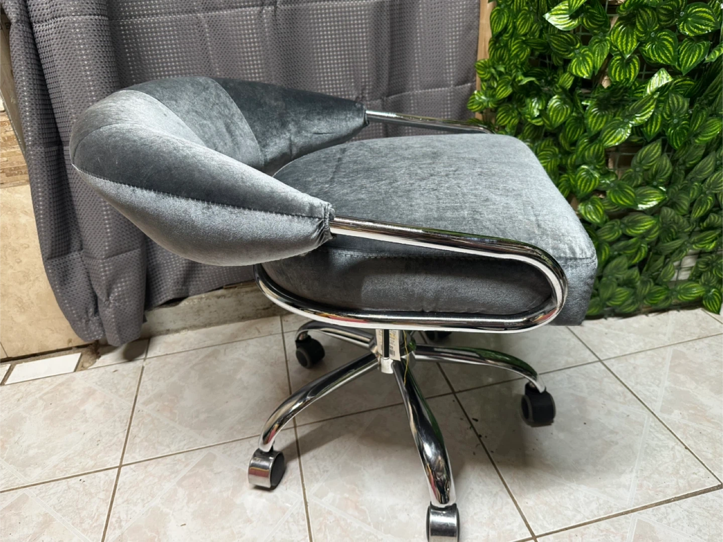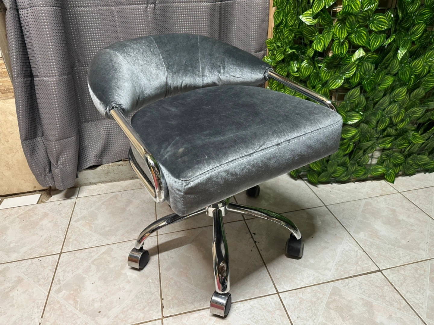 This office chair features a plush grey velvet upholstery with a comfortable curved backrest and chrome armrests.