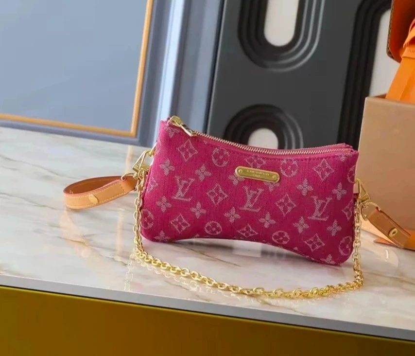 This pink pouch features the iconic monogram pattern. It comes with a leather strap and a gold-tone chain. Zipper closure.