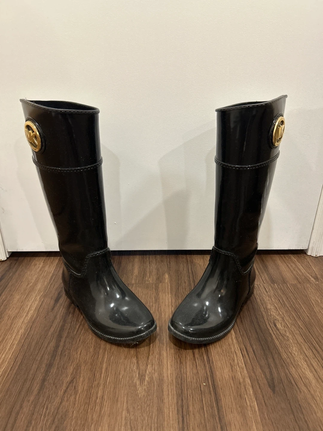 These are Michael Kors black rubber rain boots. They're shiny and feature a gold-tone MK logo emblem on the side. Perfect for keeping your feet dry on wet days!