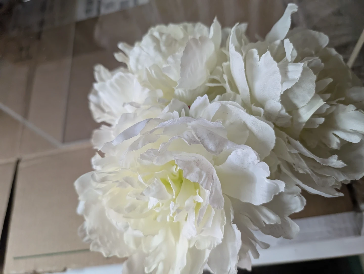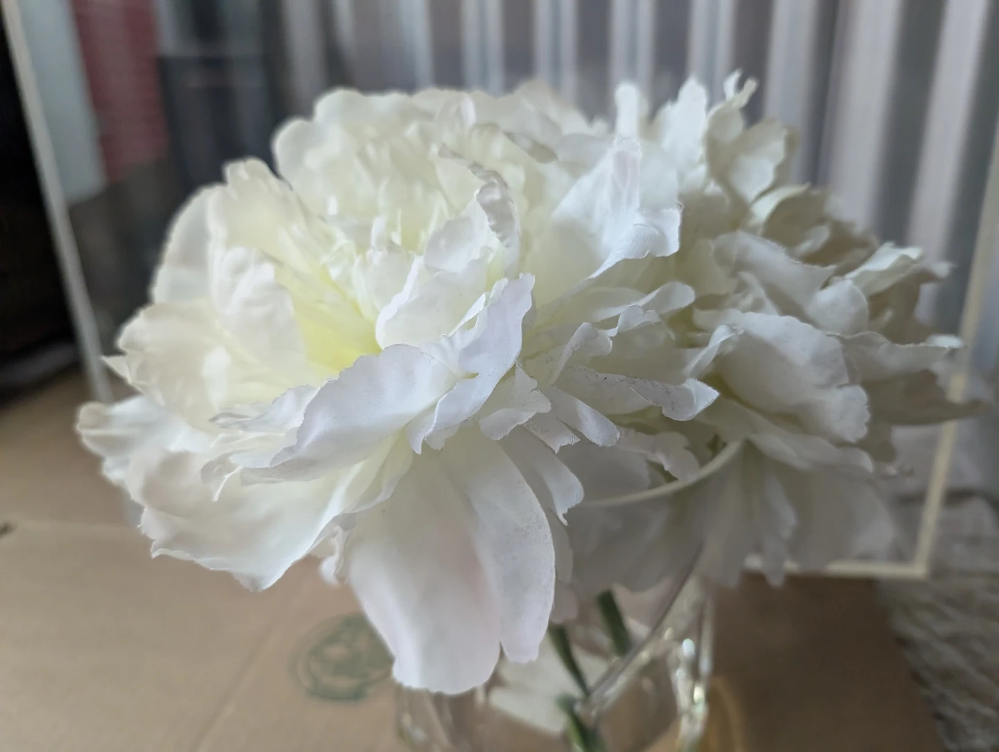 A faux bouquet of white peonies in a clear glass vase. Adds a touch of elegance to any room. Perfect for a coffee table or shelf.