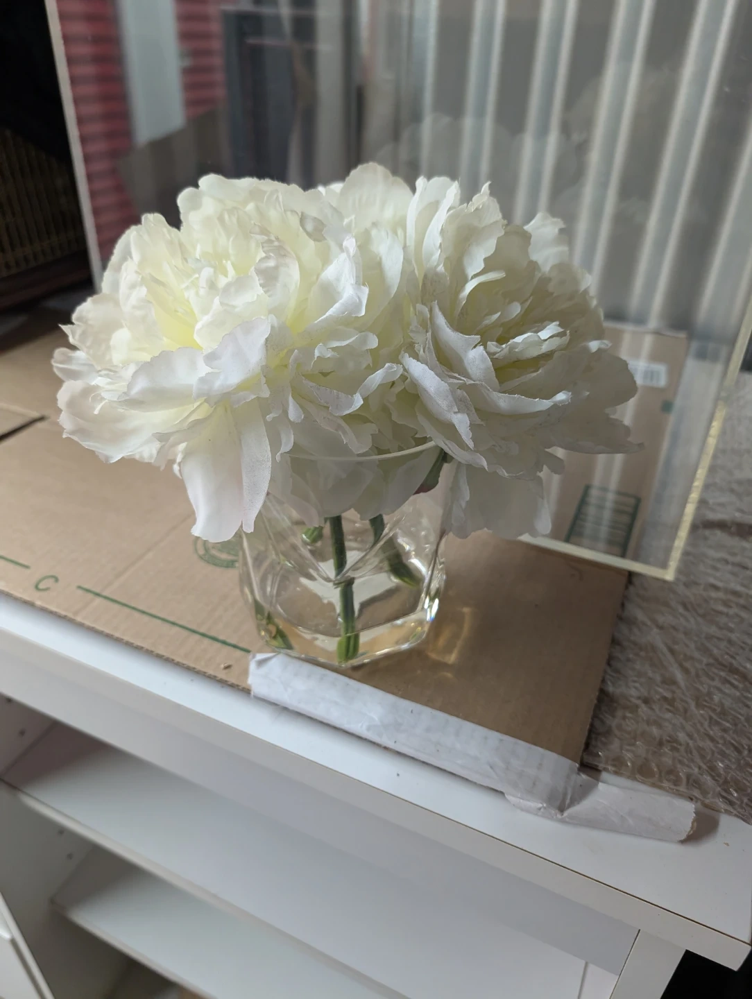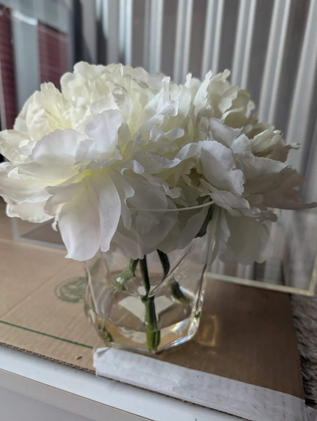 A faux bouquet of white peonies in a clear glass vase. Adds a touch of elegance to any room. Perfect for a coffee table or shelf.