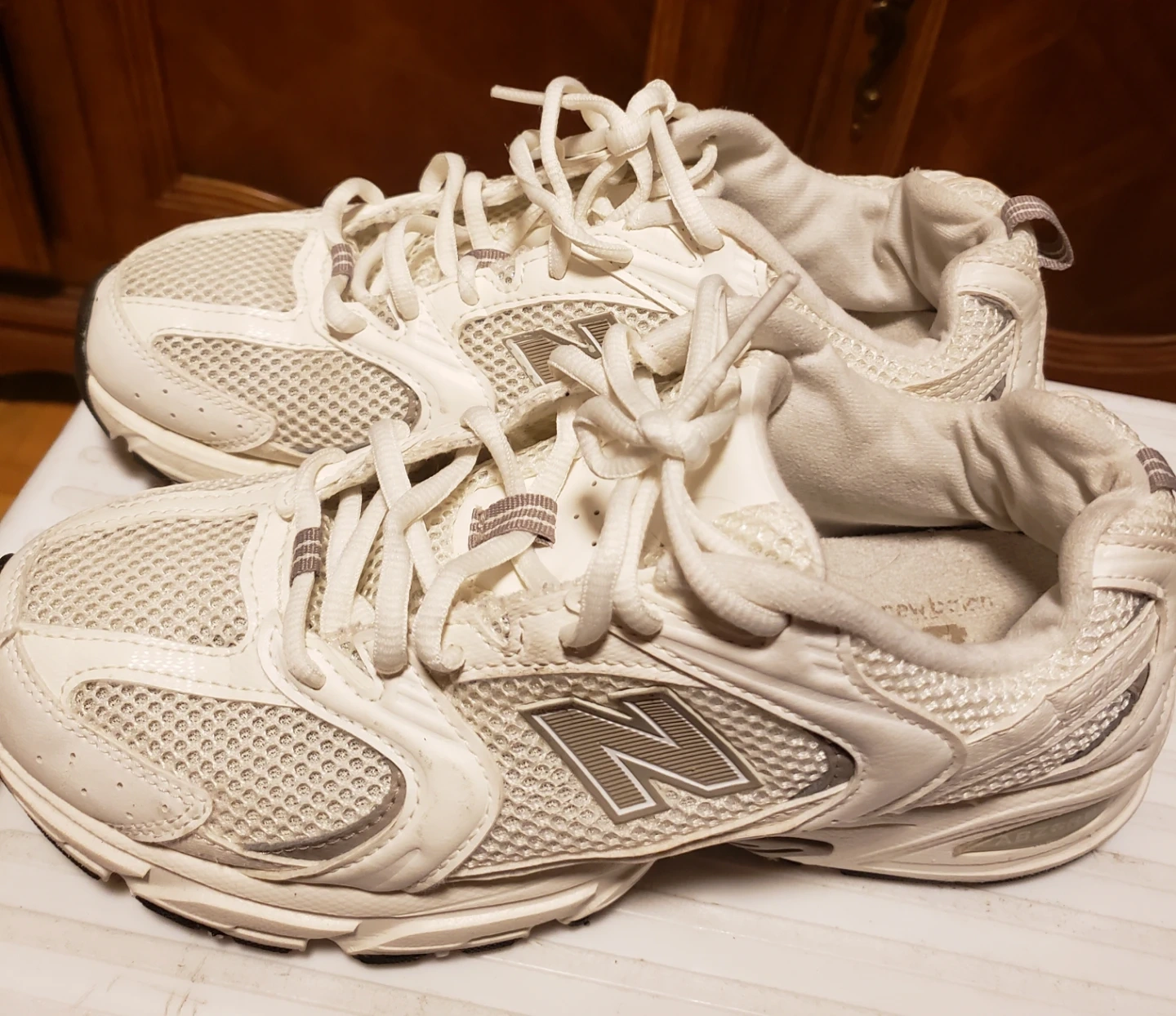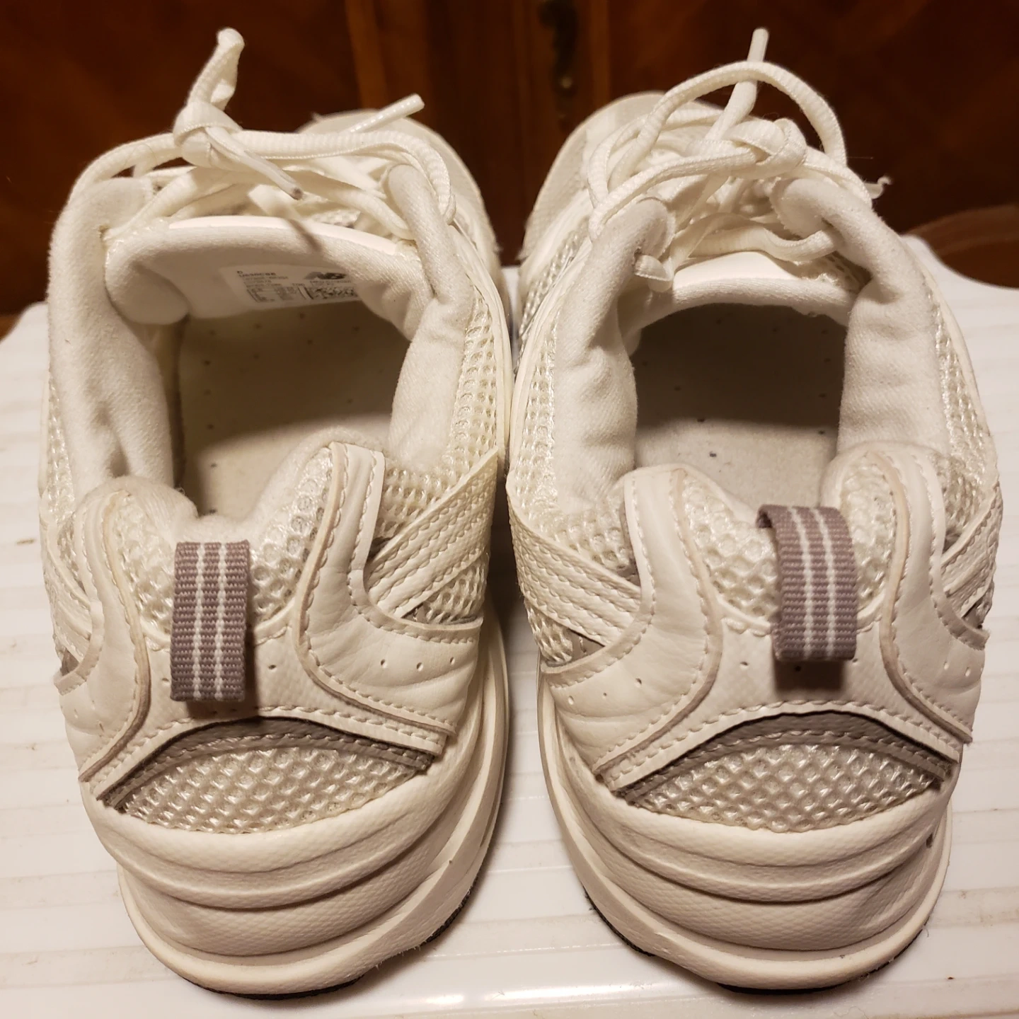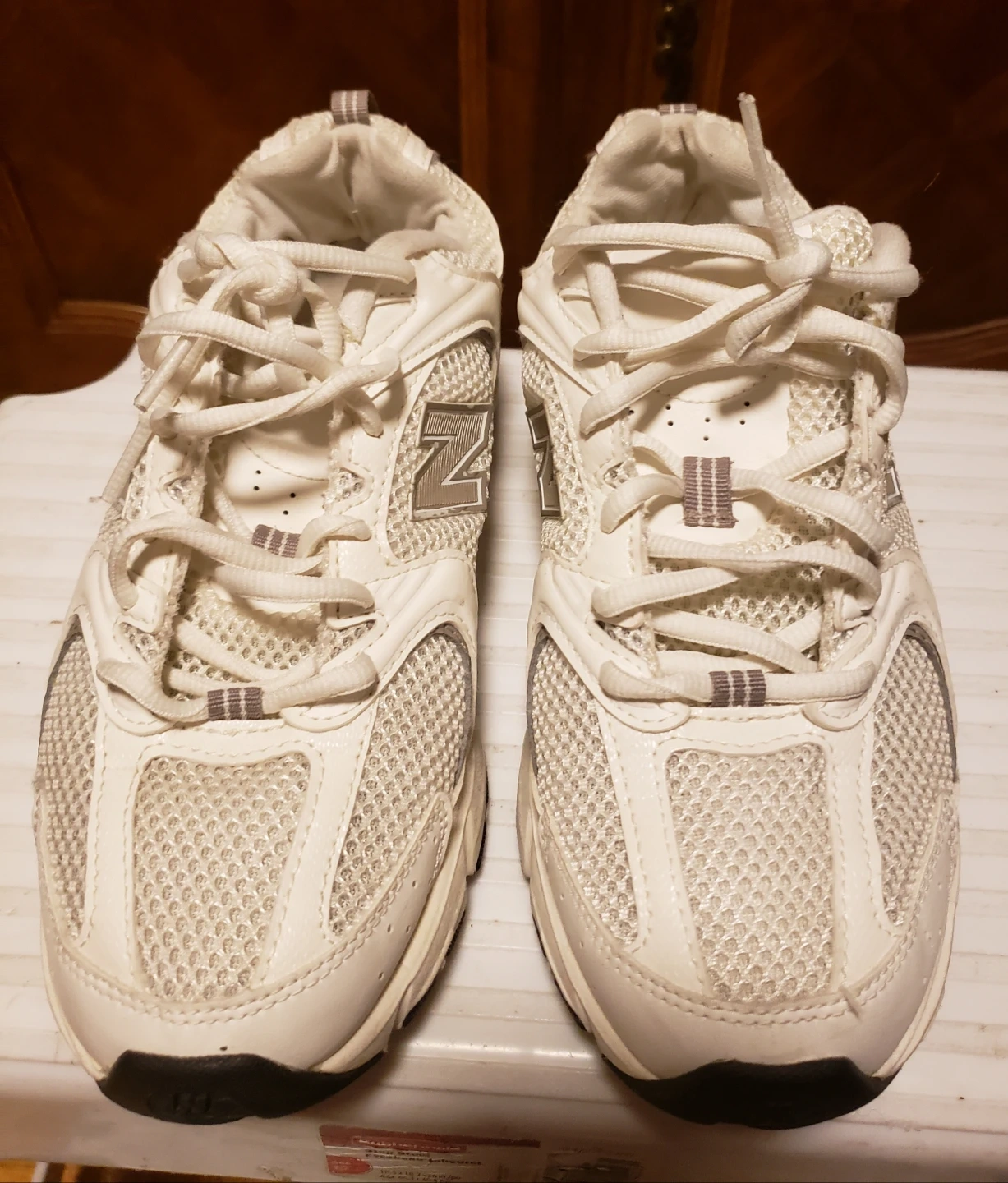 White mesh and synthetic leather New Balance running shoes. Size US W 7, EU 38, UK 5.