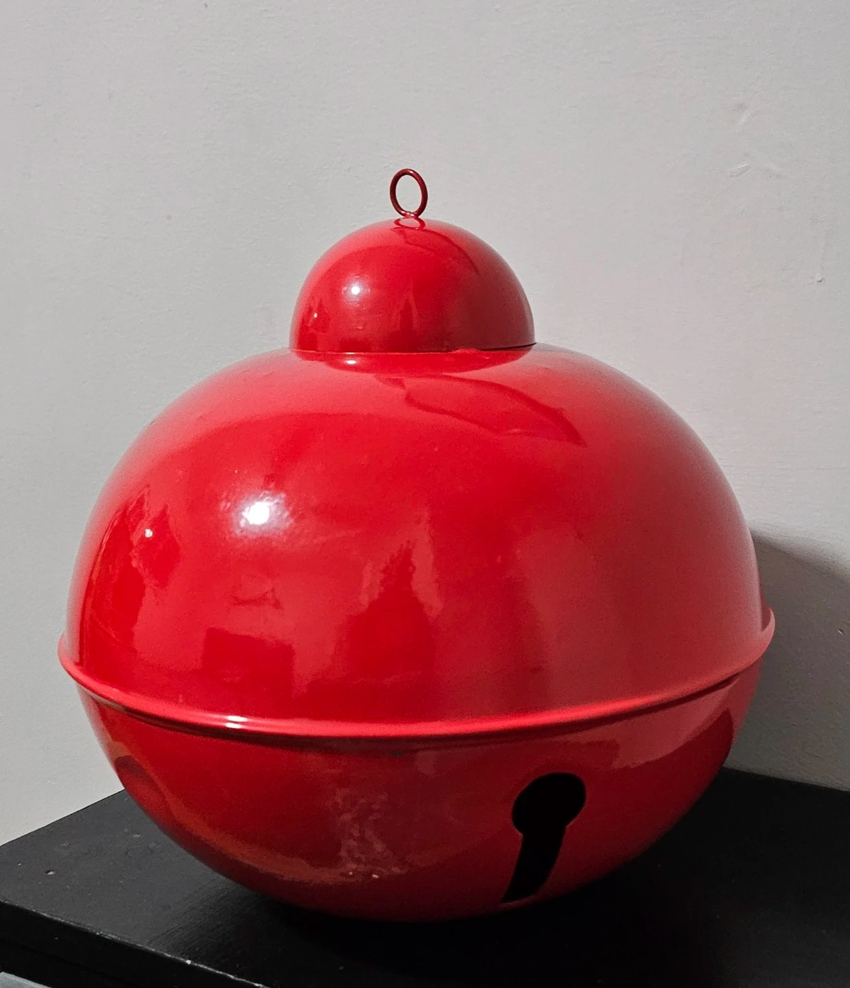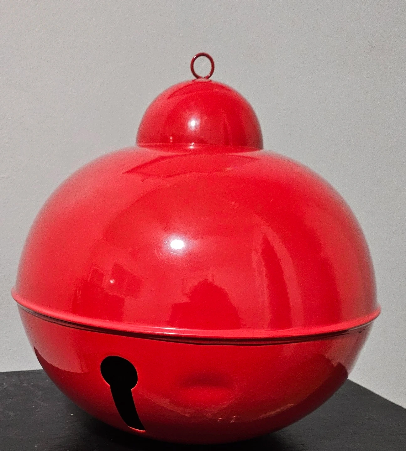 This is a large, bright red jingle bell decoration. It's made of metal and features a loop at the top for hanging. Perfect for holiday displays or festive events!