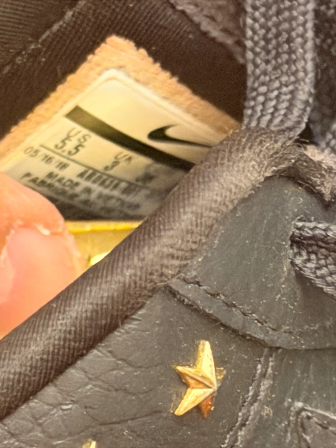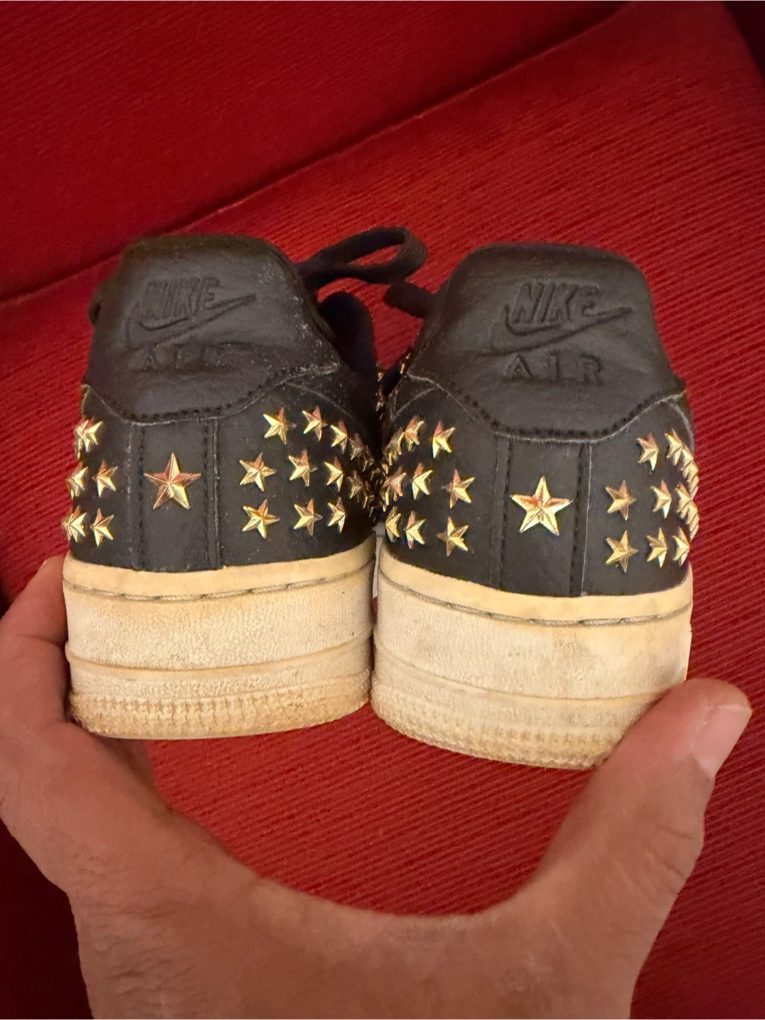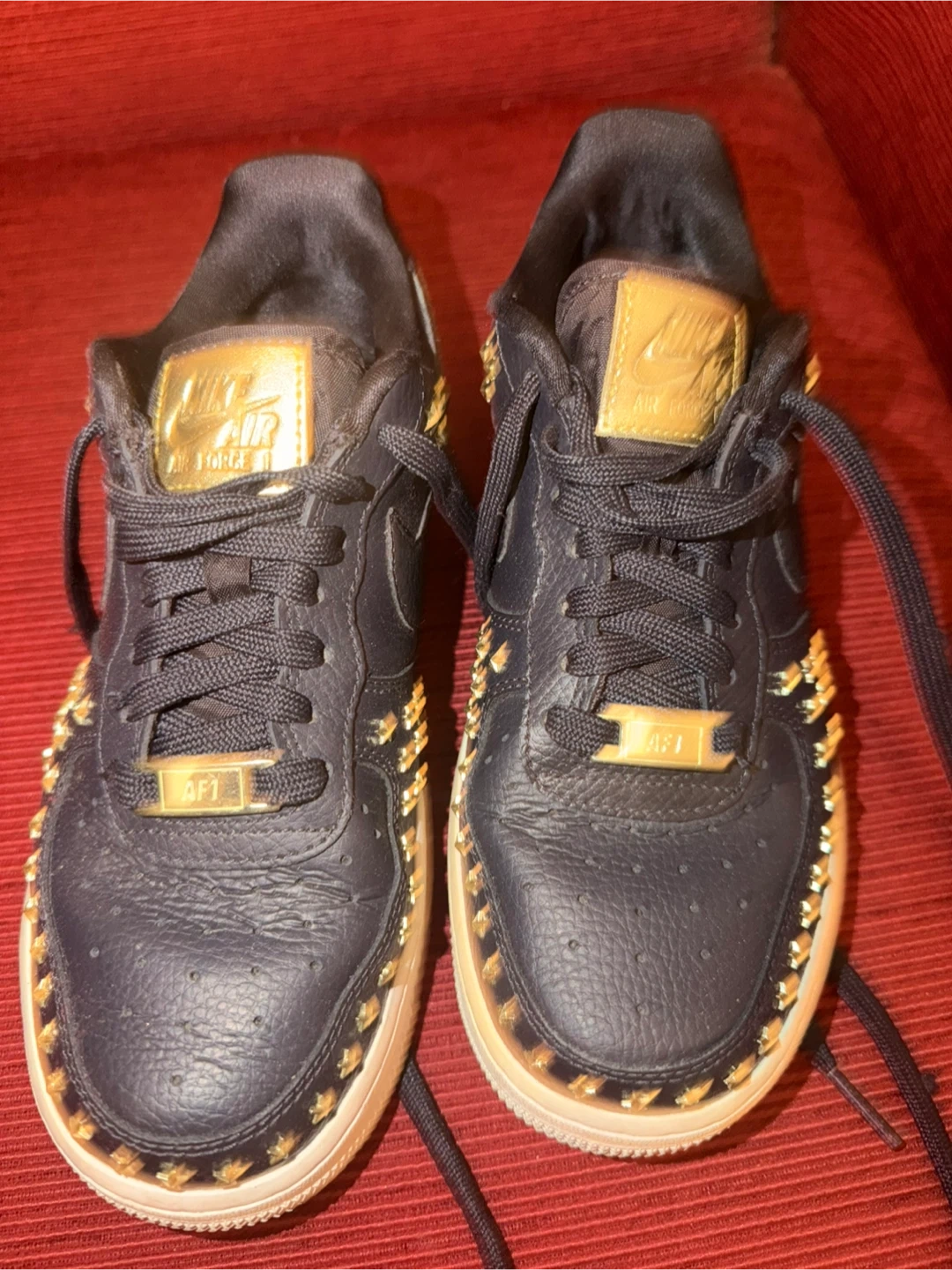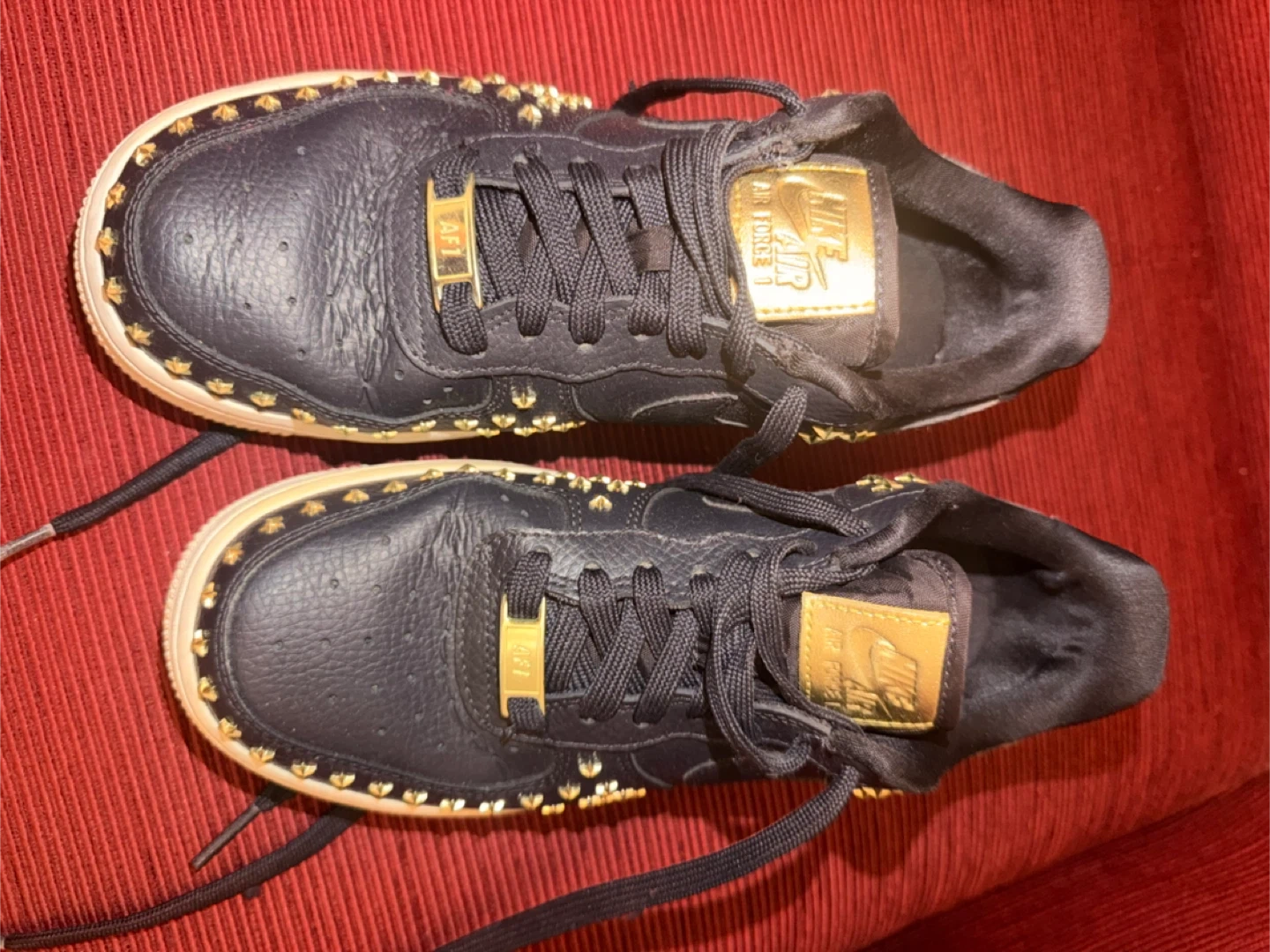These Nike Air Force 1 sneakers feature a navy blue leather upper with gold star studs around the sole and toe box. The insoles and tongue branding are gold.