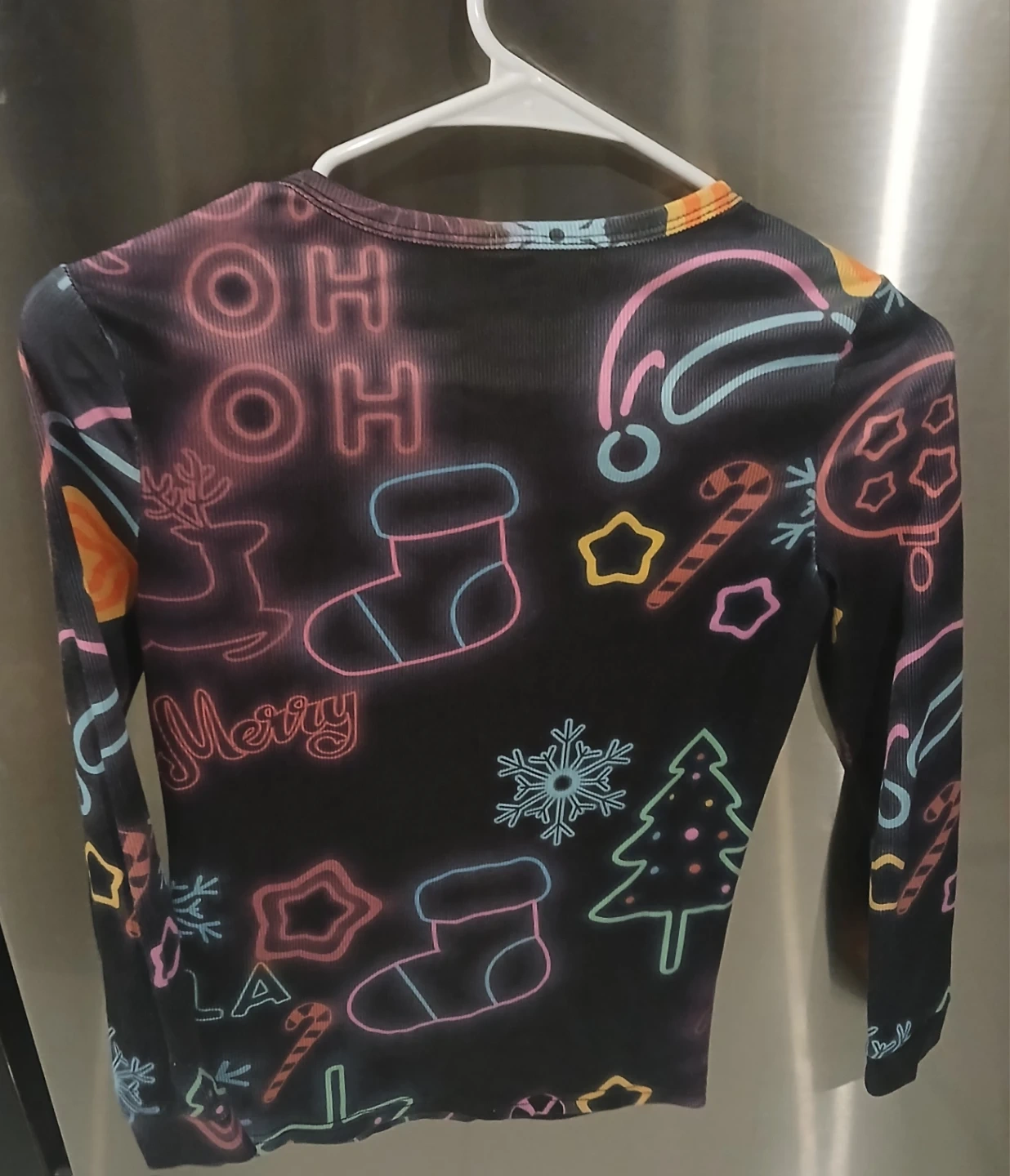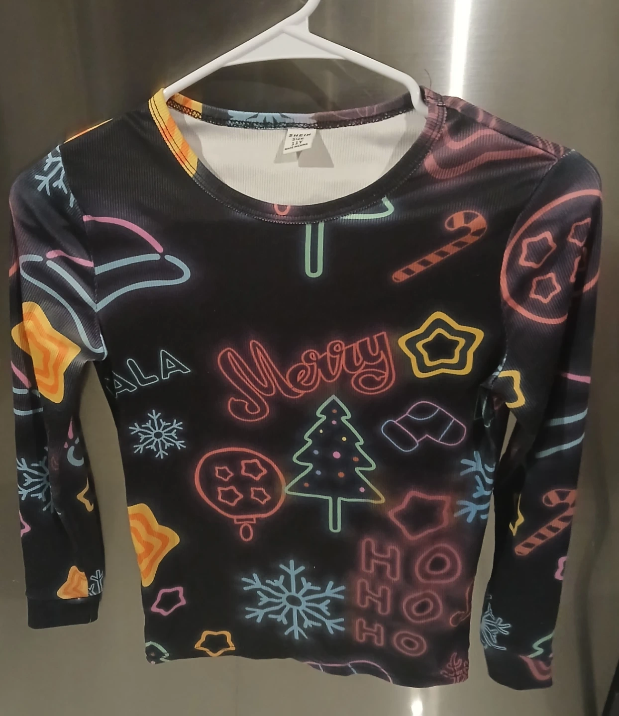 This is a fun and festive long sleeve shirt with a Christmas theme. It features colorful neon-style designs including Christmas trees, snowflakes, stars, and candy canes. Perfect for the holiday season!