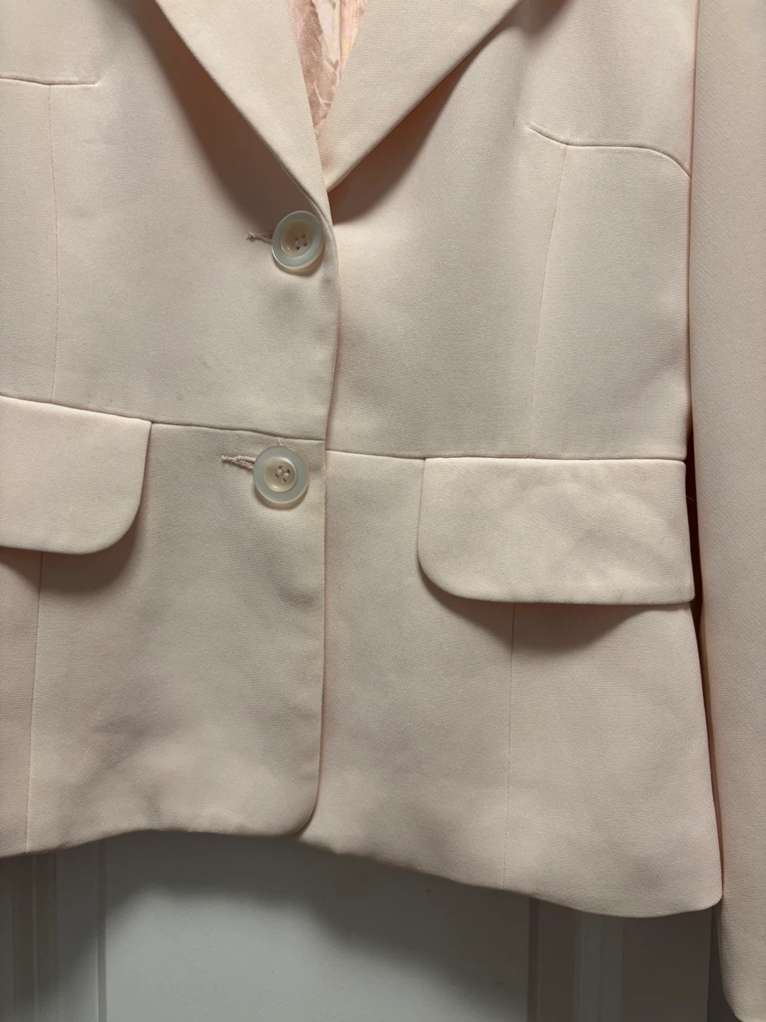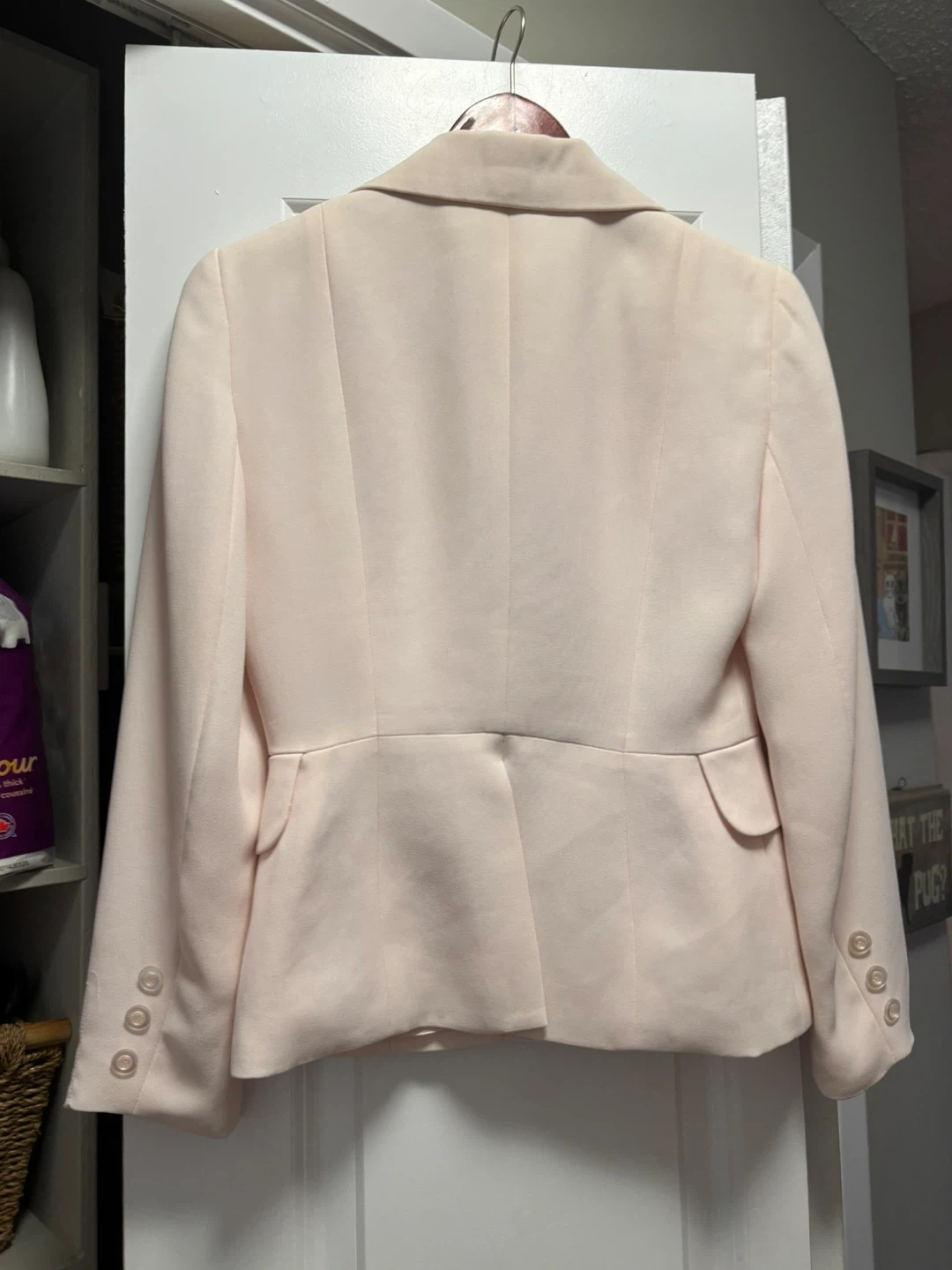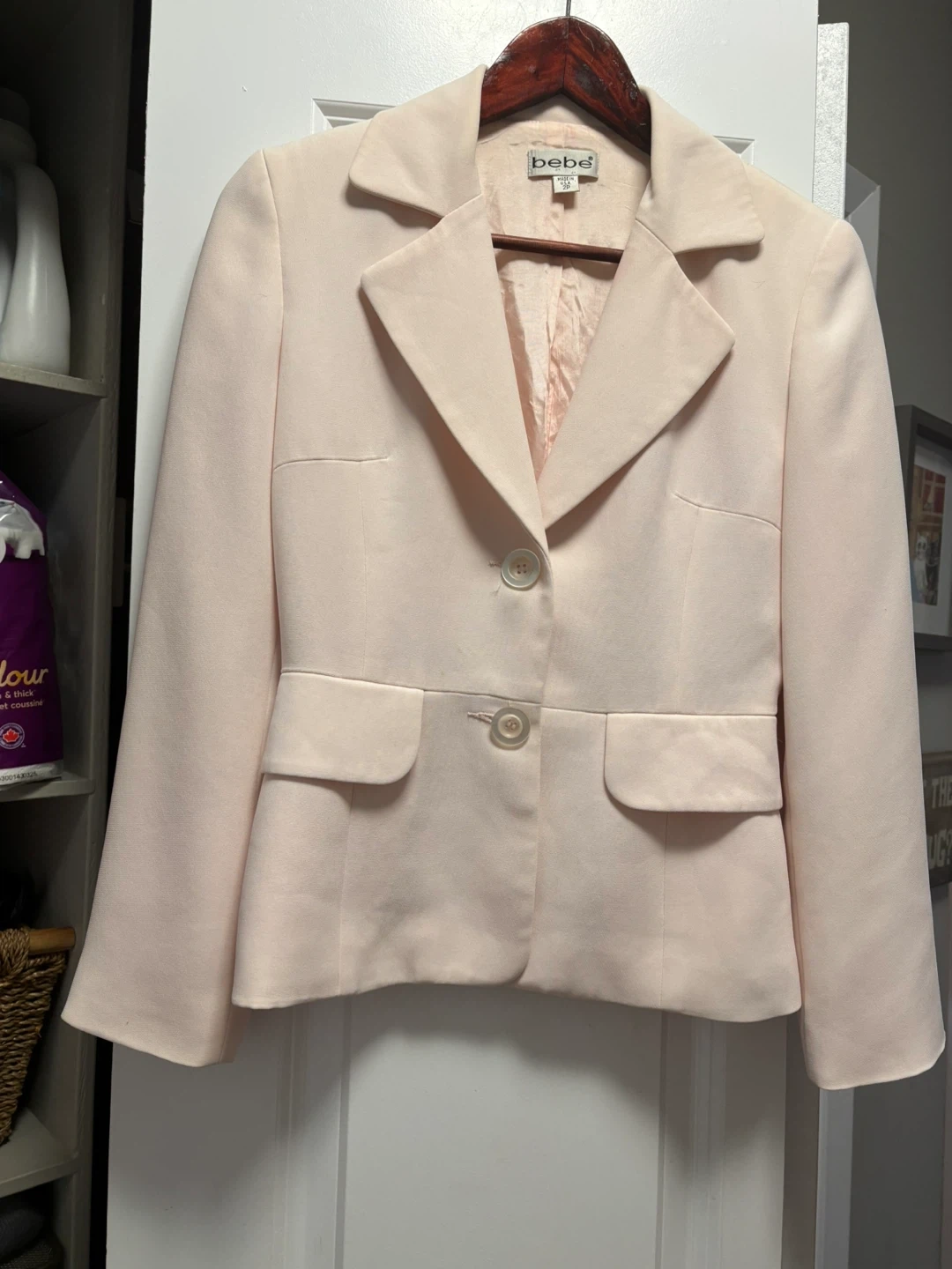 This is a light pink bebe blazer. It's a size 2 Petite. Made in the U.S.A. It features a 2 button closure at the front. Fully lined with pink satin. Gorgeous.