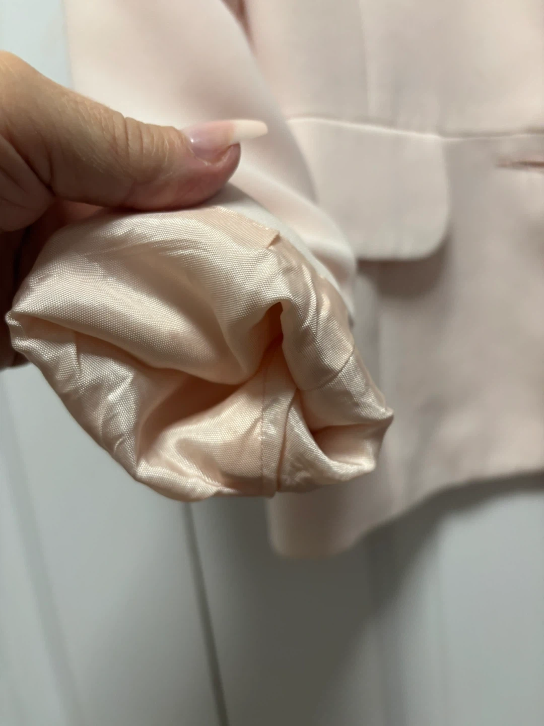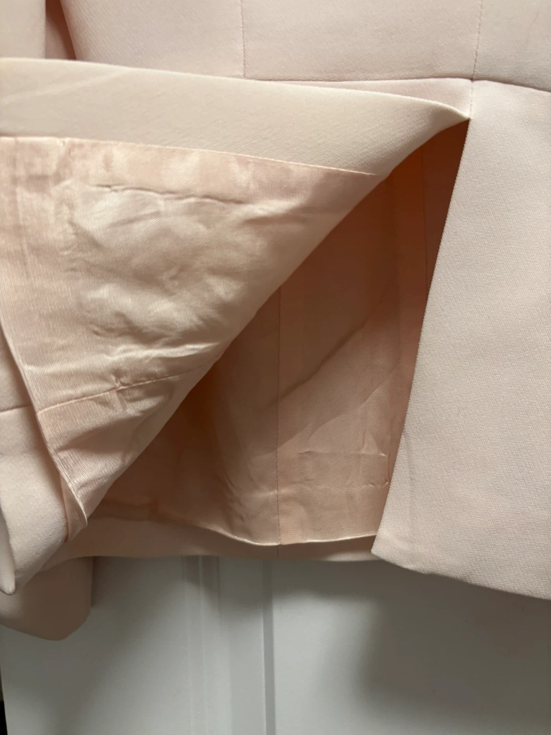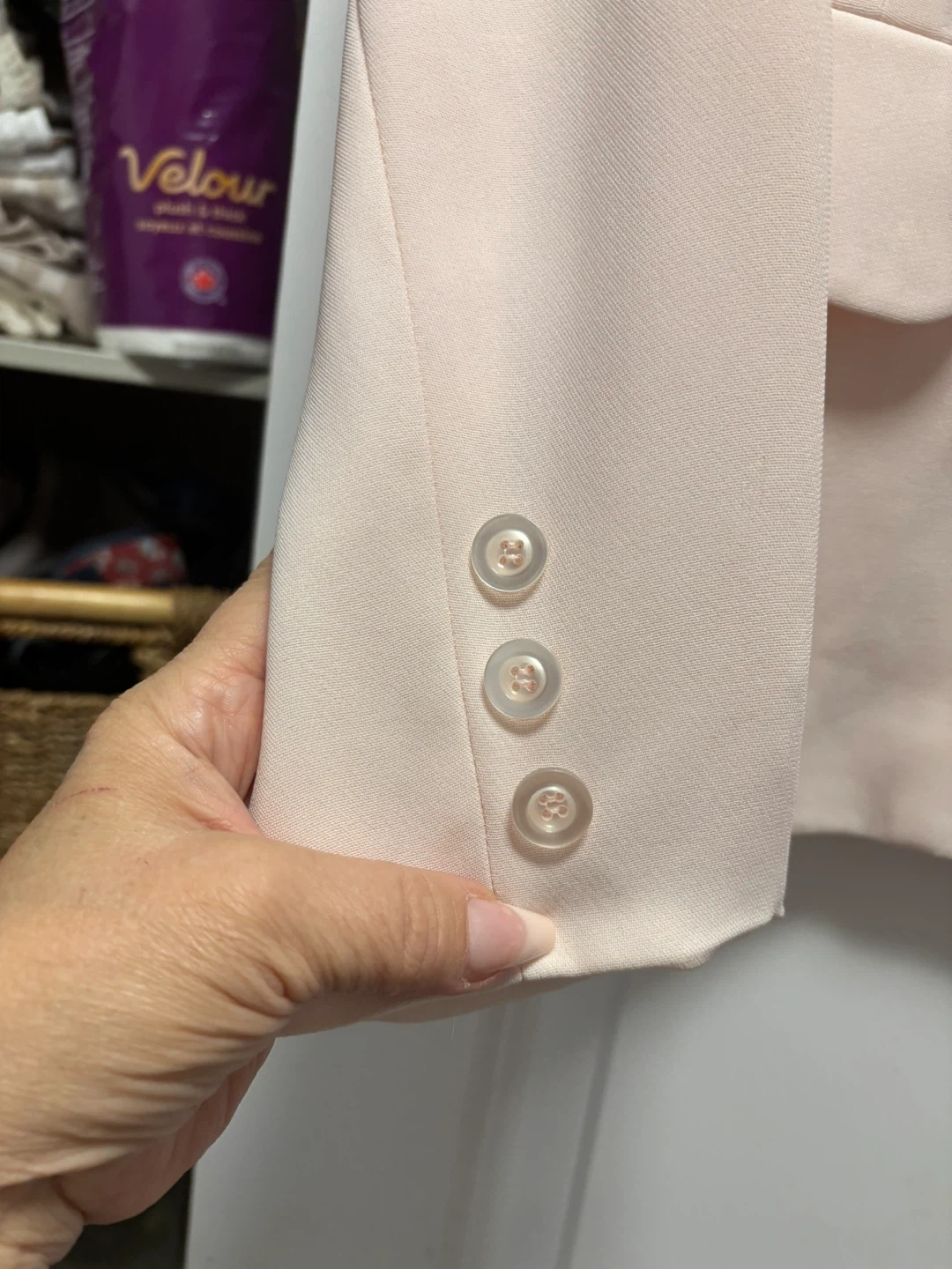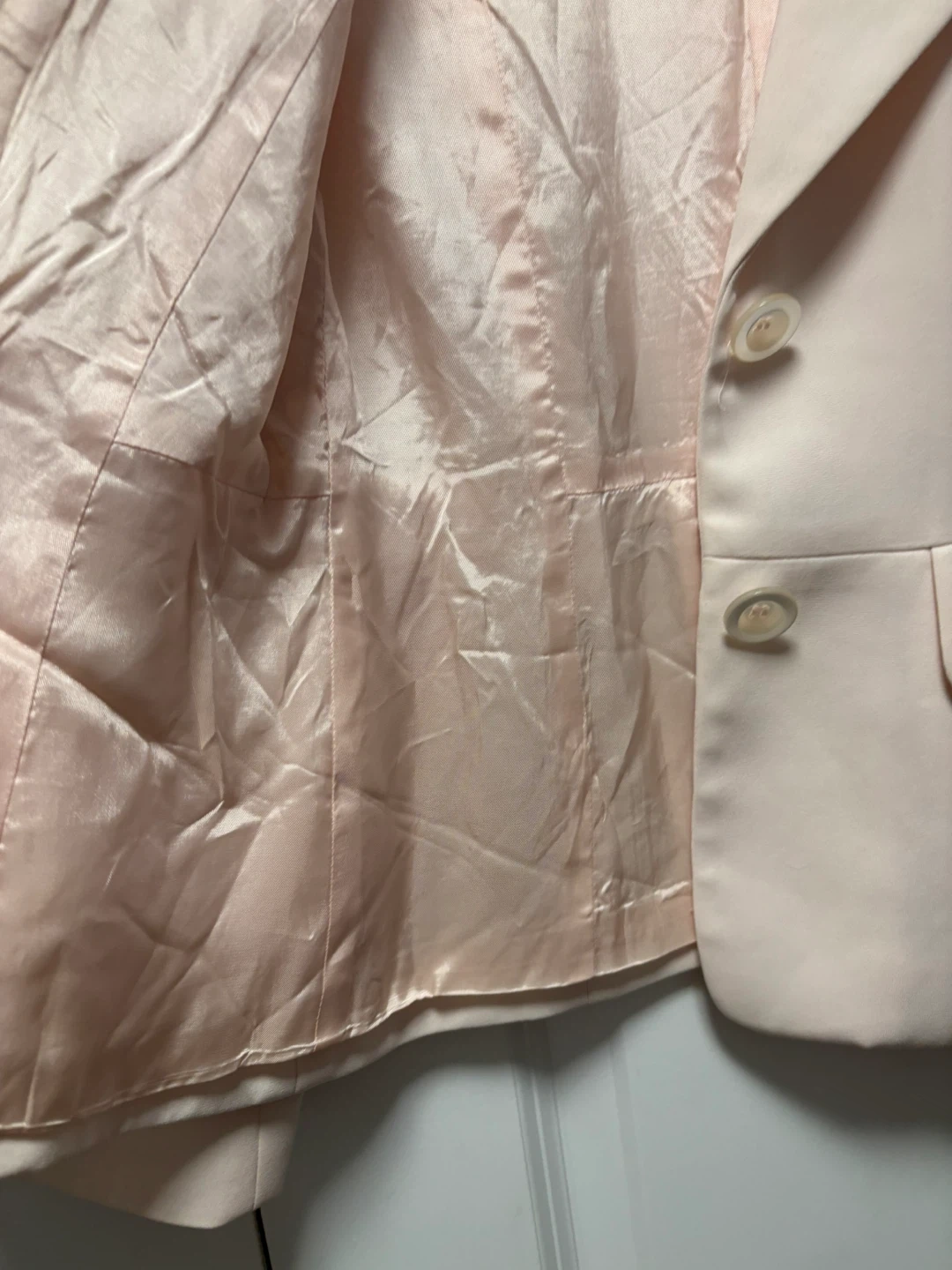 This is a light pink bebe blazer. It's a size 2 Petite. Made in the U.S.A. It features a 2 button closure at the front. Fully lined with pink satin. Gorgeous.
