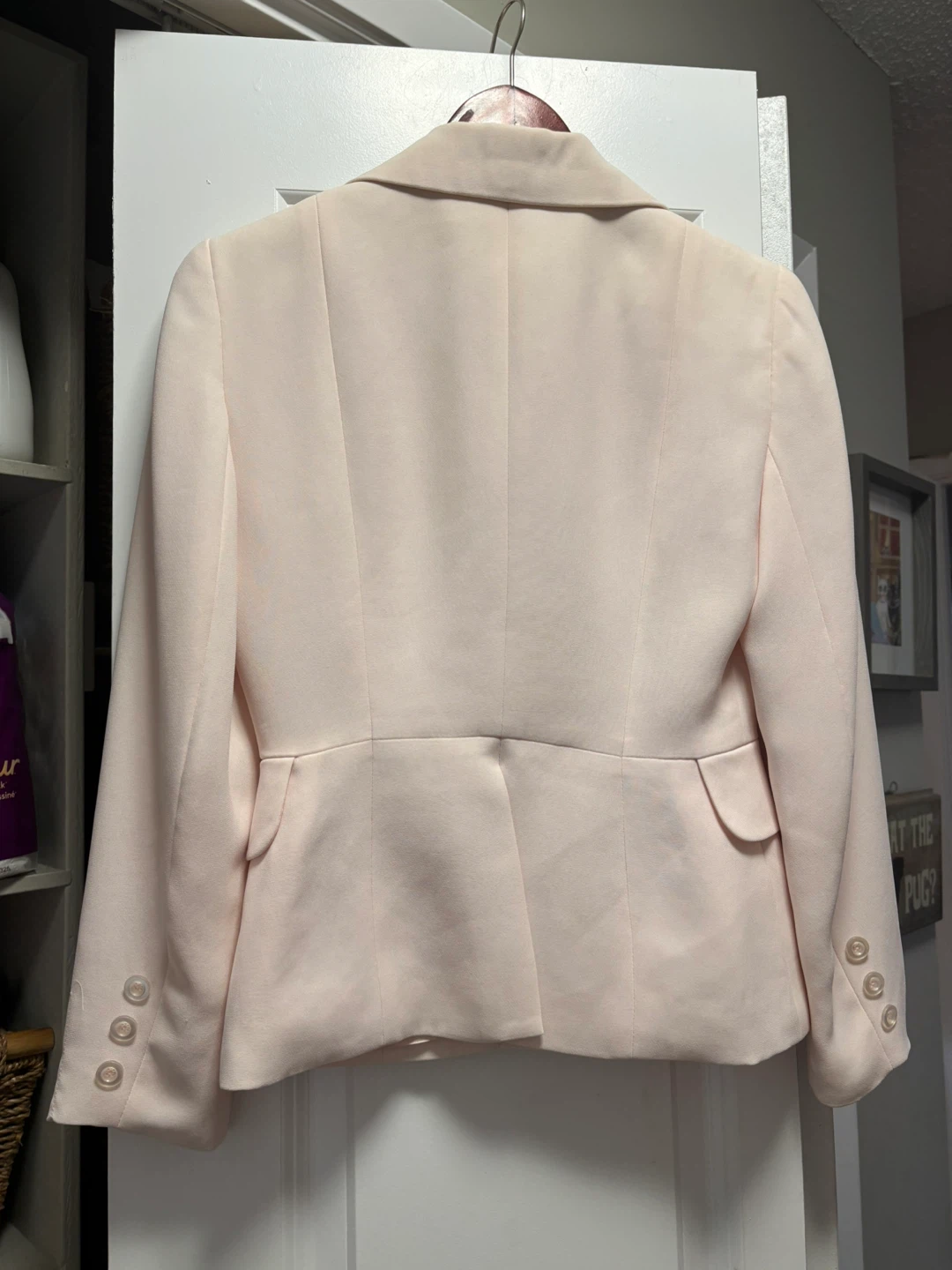 This is a light pink bebe blazer. It's a size 2 Petite. Made in the U.S.A. It features a 2 button closure at the front. Fully lined with pink satin. Gorgeous.