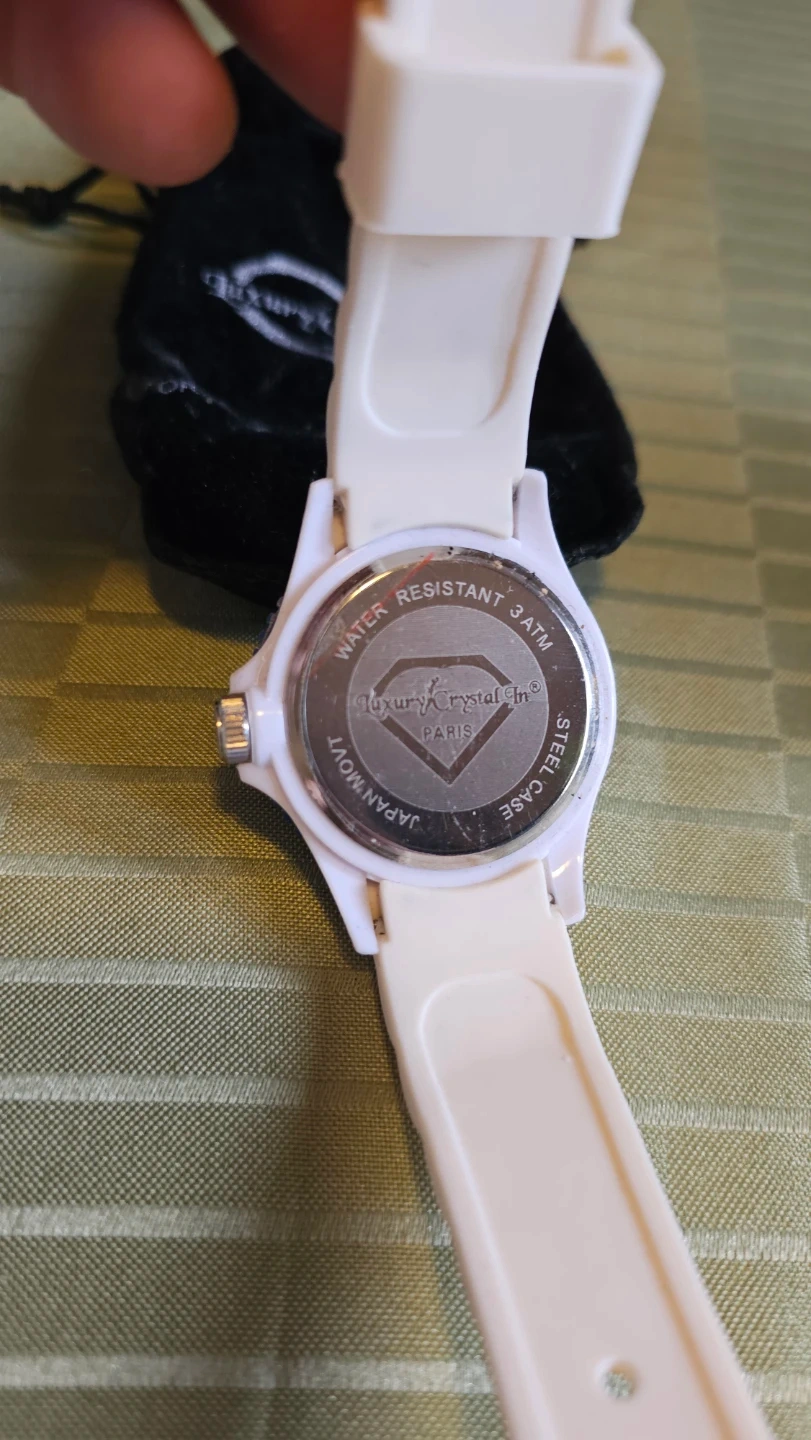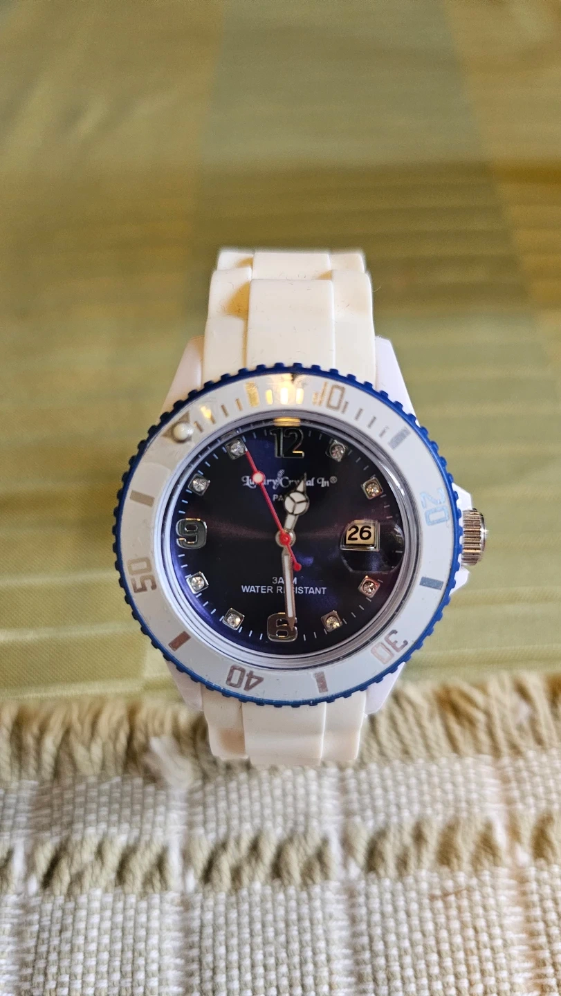 Selling a brand new Luxury Crystal In watch with a white silicone strap and blue bezel. Made in Paris.